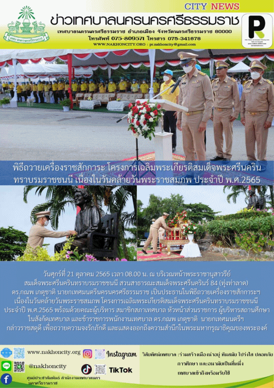 ดร.กณพ เกตุชาติ นายกเทศมนตรีนครนครศรีธรรมราช เป็นประธานในพิธีถวายเครื่องราชสักการะ โครงการเฉลิมพระเกียรติสมเด็จพระศรีนครินทราบรมราชชนนี เนื่องในวันคล้ายวันพระราชสมภพ ประจำปี พ.ศ.2565 |