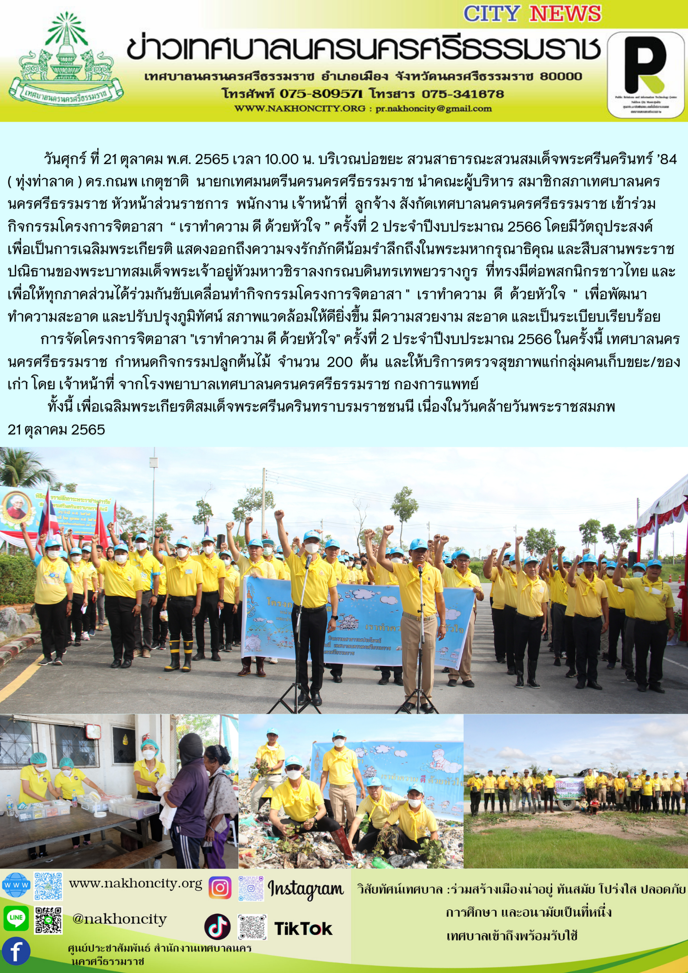 วันศุกร์ ที่ 21 ตุลาคม พ.ศ. 2565 เวลา 10.00 น. บริเวณบ่อขยะ สวนสาธารณะสวนสมเด็จพระศรีนครินทร์ ’84 ( ทุ่งท่าลาด ) ดร.กณพ เกตุชาติ นายกเทศมนตรีนครนครศรีธรรมราช นำคณะผู้บริหาร สมาชิกสภาเทศบาลนครนครศรีธรรมราช หัวหน้าส่วนราชการ พนักงาน เจ้าหน้าที่ ลูกจ้าง สังกัดเทศบาลนครนครศรีธรรมราช เข้าร่วมกิจกรรมโครงการจิตอาสา “ เราทำความ ดี ด้วยหัวใจ ” ครั้งที่ 2 ประจำปีงบประมาณ 2566 โดยมีวัตถุประสงค์ เพื่อเป็นการเฉลิมพระเกียรติ แสดงออกถึงความจงรักภักดีน้อมรำลึกถึงในพระมหากรุณาธิคุณ และสืบสานพระราชปณิธานของพระบาทสมเด็จพระเจ้าอยู่หัวมหาวชิราลงกรณบดินทรเทพยวรางกูร ที่ทรงมีต่อพสกนิกรชาวไทย และเพื่อให้ทุกภาคส่วนได้ร่วมกันขับเคลื่อนทำกิจกรรมโครงการจิตอาสา "เราทำความ ดี ด้วยหัวใจ " เพื่อพัฒนา ทำความสะอาด และปรับปรุงภูมิทัศน์ สภาพแวดล้อมให้ดียิ่งขึ้น มีความสวยงาม สะอาด และเป็นระเบียบเรียบร้อย การจัดโครงการจิตอาสา "เราทำความ ดี ด้วยหัวใจ" ครั้งที่ 2 ประจำปีงบประมาณ 2566 ในครั้งนี้ เทศบาลนครนครศรีธรรมราช กำหนดกิจกรรมปลูกต้นไม้ จำนวน 200 ต้น และให้บริการตรวจสุขภาพแก่กลุ่มคนเก็บขยะ/ของเก่า โดย เจ้าหน้าที่ จากโรงพยาบาลเทศบาลนครนครศรีธรรมราช กองการแพทย์ ทั้งนี้ เพื่อเฉลิมพระเกียรติสมเด็จพระศรีนครินทราบรมราชชนนี เนื่องในวันคล้ายวันพระราชสมภพ 21 ตุลาคม 2565 ข่าว/แสงจันทร์ ภาพ/แสงจันทร์/ไกรสิทธิ ตรวจทาน/ฐิตินันท์