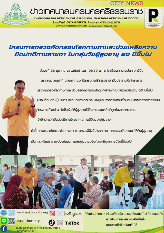 ดร.กณพ เกตุชาติ นายกเทศมนตรีนครนครศรีธรรมราช เป็นประธานเปิดโครงการตรวจคัดกรองโรคทางตาและช่วยเหลือความผิดปกติทางสายตา ในกลุ่มวัยผู้สูงอายุ 60 ปีขึ้นไป เขตเทศบาลนครนครศรีธรรมราช ประจำปี 2565 |