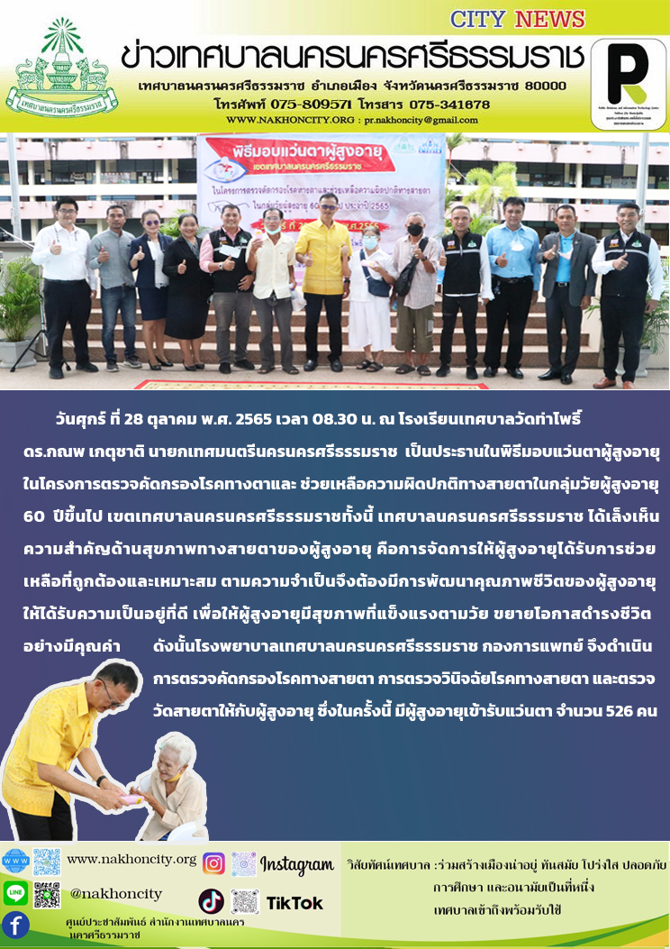 วันศุกร์ ที่ 28 ตุลาคม พ.ศ. 2565 เวลา 08.30 น. ณ โรงเรียนเทศบาลวัดท่าโพธิ์ ดร.กณพ เกตุชาติ นายกเทศมนตรีนครนครศรีธรรมราช เป็นประธานในพิธีมอบแว่นตาผู้สูงอายุในโครงการตรวจคัดกรองโรคทางตาและช่วยเหลือความผิดปกติทางสายตาในกลุ่มวัยผู้สูงอายุ 60 ปีขึ้นไป เขตเทศบาลนครนครศรีธรรมราช ทั้งนี้ เทศบาลนครนครศรีธรรมราช ได้เล็งเห็นความสำคัญด้านสุขภาพทางสายตาของผู้สูงอายุ คือการจัดการให้ผู้สูงอายุได้รับการช่วยเหลือที่ถูกต้องและเหมาะสม ตามความจำเป็นจึงต้องมีการพัฒนาคุณภาพชีวิตของผู้สูงอายุให้ได้รับความเป็นอยู่ที่ดี เพื่อให้ผู้สูงอายุมีสุขภาพที่แข็งแรงตามวัย ขยายโอกาสดำรงชีวิตอย่างมีคุณค่า ดังนั้นโรงพยาบาลเทศบาลนครนครศรีธรรมราช กองการแพทย์ จึงดำเนินการตรวจคัดกรองโรคทางสายตา การตรวจวินิจฉัยโรคทางสายตา และตรวจวัดสายตาให้กับผู้สูงอายุ ซึ่งในครั้งนี้ มีผู้สูงอายุเข้ารับแว่นตา จำนวน 526 คน