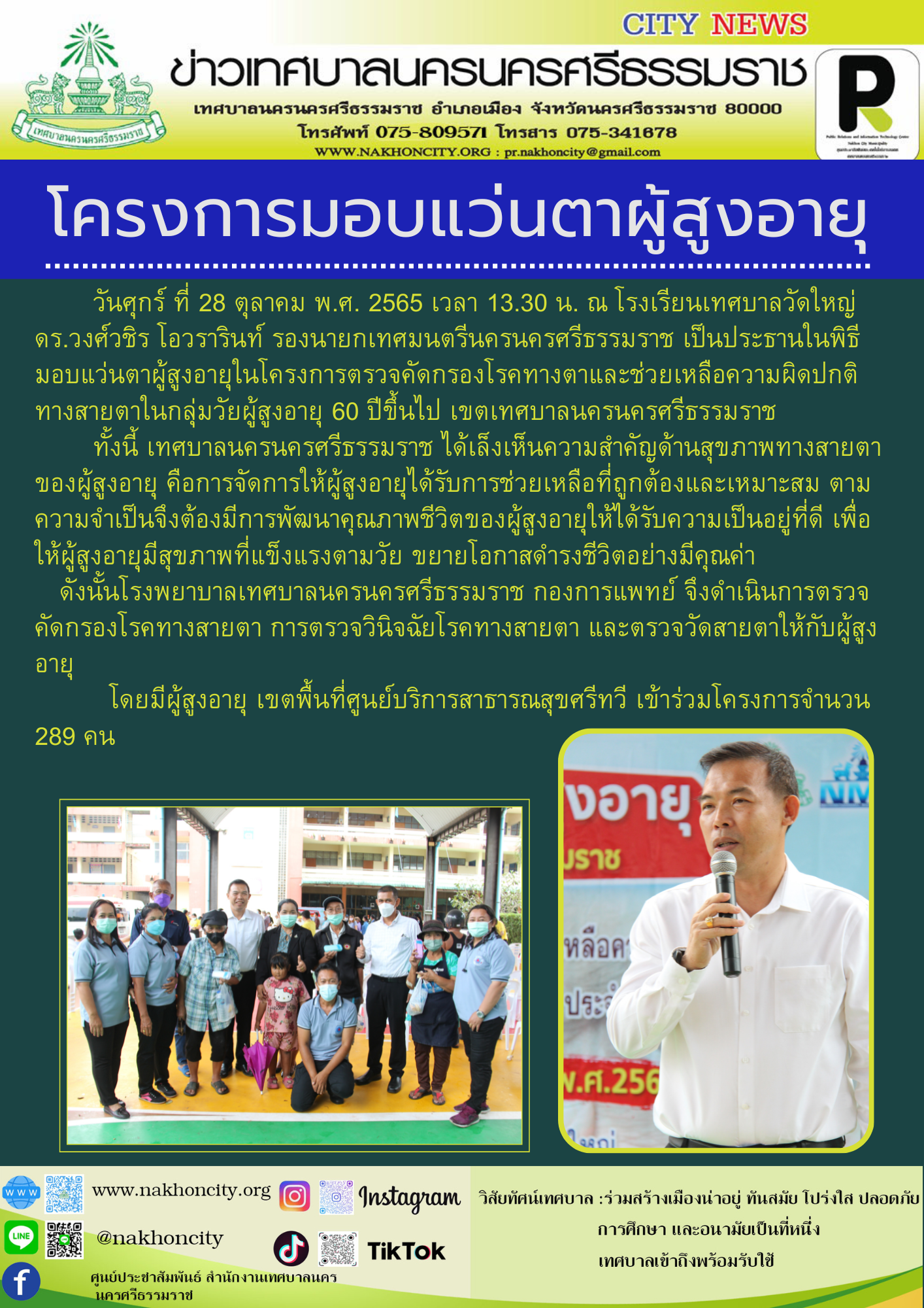 วันศุกร์ ที่ 28 ตุลาคม พ.ศ. 2565 เวลา 13.30 น. ณ โรงเรียนเทศบาลวัดใหญ่ ดร.วงศ์วชิร โอวรารินท์ รองนายกเทศมนตรีนครนครศรีธรรมราช เป็นประธานในพิธีมอบแว่นตาผู้สูงอายุในโครงการตรวจคัดกรองโรคทางตาและช่วยเหลือความผิดปกติทางสายตาในกลุ่มวัยผู้สูงอายุ 60 ปีขึ้นไป เขตเทศบาลนครนครศรีธรรมราช ทั้งนี้ เทศบาลนครนครศรีธรรมราช ได้เล็งเห็นความสำคัญด้านสุขภาพทางสายตาของผู้สูงอายุ คือการจัดการให้ผู้สูงอายุได้รับการช่วยเหลือที่ถูกต้องและเหมาะสม ตามความจำเป็นจึงต้องมีการพัฒนาคุณภาพชีวิตของผู้สูงอายุให้ได้รับความเป็นอยู่ที่ดี เพื่อให้ผู้สูงอายุมีสุขภาพที่แข็งแรงตามวัย ขยายโอกาสดำรงชีวิตอย่างมีคุณค่า ดังนั้นโรงพยาบาลเทศบาลนครนครศรีธรรมราช กองการแพทย์ จึงดำเนินการตรวจคัดกรองโรคทางสายตา การตรวจวินิจฉัยโรคทางสายตา และตรวจวัดสายตาให้กับผู้สูงอายุ โดยมีผู้สูงอายุ เขตพื้นที่ศูนย์บริการสาธารณสุขศรีทวี เข้าร่วมโครงการจำนวน 289 คน |