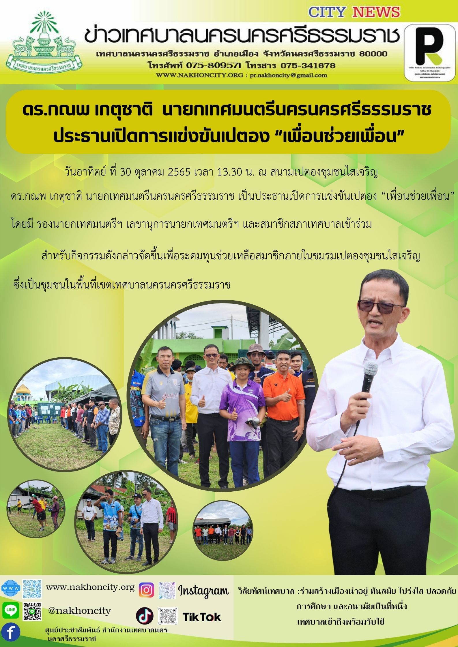 วันอาทิตย์ ที่ 30 ตุลาคม 2565 เวลา 13.30 น. ณ สนามเปตองชุมชนไสเจริญ ดร.กณพ เกตุชาติ นายกเทศมนตรีนครนครศรีธรรมราช เป็นประธานเปิดการแข่งขันกีฬาเปตอง "เพื่อนช่วยเพื่อน" โดยมี รองนายกเทศมนตรีฯ เลขานุการนายกเทศมนตรีฯ และสมาชิกสภาเทศบาลเข้าร่วม สำหรับการจัดการแข่งขันดังกล่าว จัดขึ้นเพื่อระดมทุนช่วยเหลือเพื่อนสมาชิกในชมรมเปตองชุมชนไสเจริญ ซึ่งเป็นชุมชนในเขตเทศบาลนครนครศรีธรรมราช ภาพ//ข่าว : อรชุมา ตรวจทาน : ฐิตินันท์ |