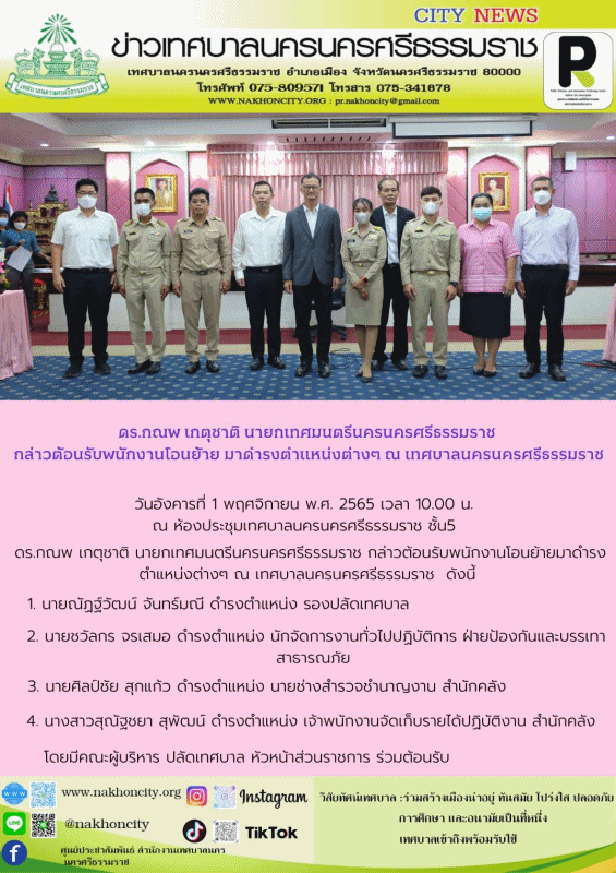 ดร.กณพ เกตุชาติ นายกเทศมนตรีนครนครศรีธรรมราช กล่าวต้อนรับพนักงานโอนย้าย มาดำรงตำแหน่งต่างๆ ณ เทศบาลนครนครศรีธรรมราช |