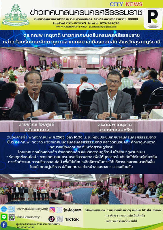 วันอังคารที่ 1 พฤศจิกายน พ.ศ.2565 เวลา 10.30 น. ณ ห้องประชุมเทศบาลนครนครศรีธรรมราช ชั้น5 ดร.กณพ เกตุชาติ นายกเทศมนตรีนครนครศรีธรรมราช กล่าวต้อนรับคณะศึกษาดูงานจากเทศบาลเมืองดอนสัก จังหวัดสุราษฎร์ธานี โดยเทศบาลเมืองดอนสัก อำเภอดอนสัก จังหวัดสุราษฎร์ธานี เข้าศึกษาดูงานระบบ “ ร้องทุกข์ออนไลน์ ” ของเทศบาลนครนครศรีธรรมราช เพื่อให้บุคลากรในสังกัดได้เรียนรู้เกี่ยวกับการจัดทำระบบการบริการออนไลน์ เพื่อให้เกิดประสิทธิภาพในการให้บริการประชาชนมากยิ่งขึ้น โดยมี คณะผู้บริหาร ปลัดเทศบาล หัวหน้าส่วนราชการ ร่วมต้อนรับ ................ ภาพ//ข่าว//จันทร์จิรา ตรวจทาน//ฐิตินันท์ |