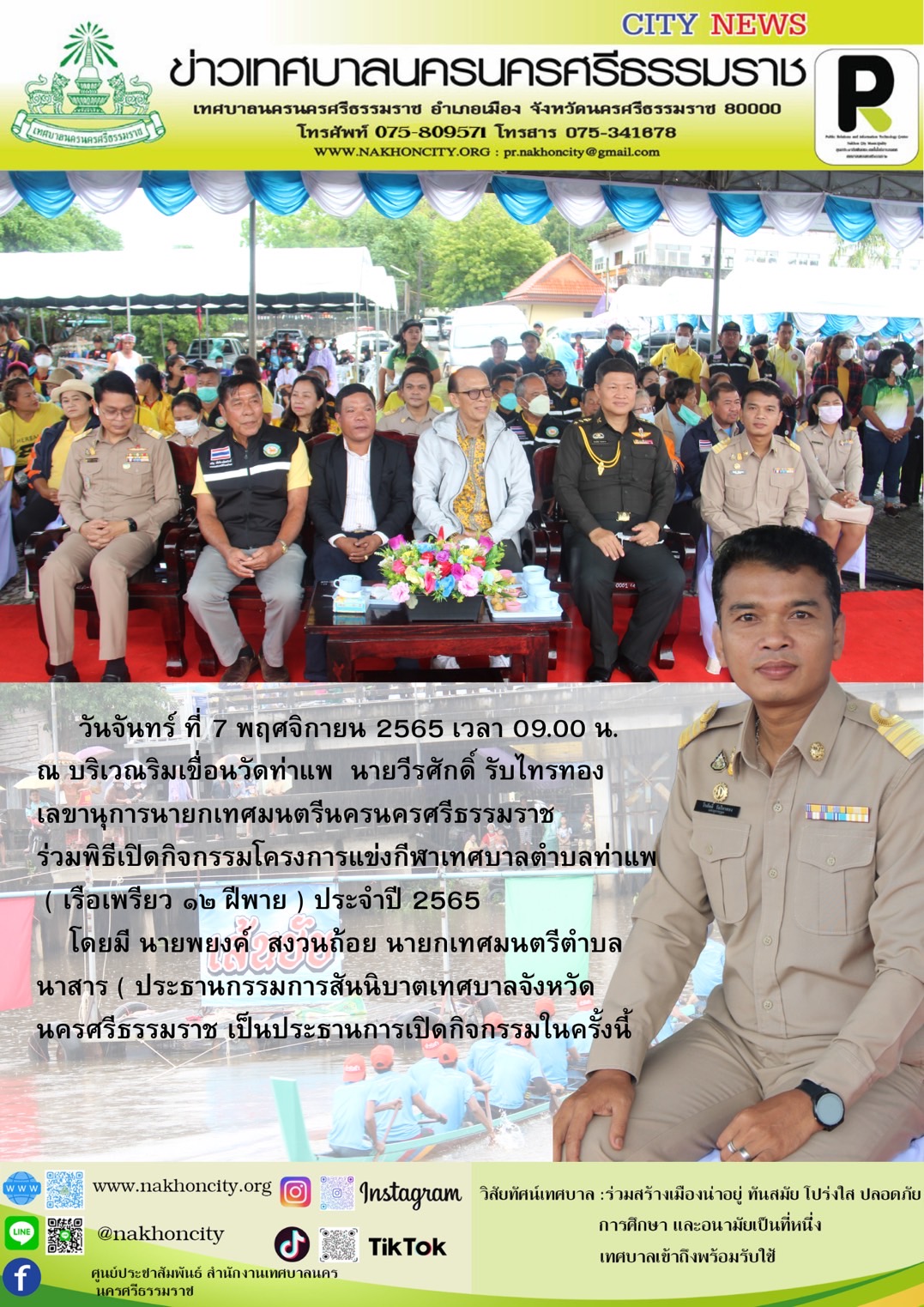นายวีระศักดิ์ รับไทรทอง เลขานุการนายกเทศมนตรีนครนครศรีธรรมราช ร่วมพิธีเปิดจกรรมโครงการแข่งกีฬาเทศบาลตำบลท่าแพ ( เรือเพรียว 12 ฝีพาย ) ประจำปี 2565 |