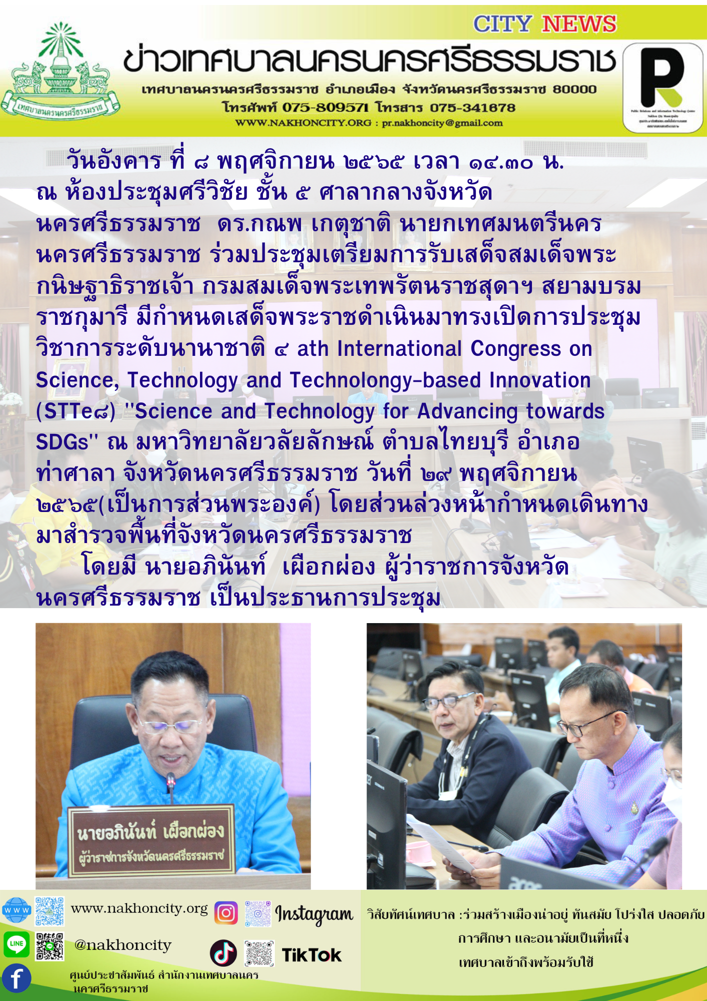 วันอังคาร ที่ ๘ พฤศจิกายน ๒๕๖๕ เวลา ๑๔.๓๐ น. ณ ห้องประชุมศรีวิชัย ชั้น ๕ ศาลากลางจังหวัดนครศรีธรรมราช ดร.กณพ เกตุชาติ นายกเทศมนตรีนครนครศรีธรรมราช ร่วมประชุมเตรียมการรับเสด็จสมเด็จพระกนิษฐาธิราชเจ้า กรมสมเด็จพระเทพรัตนราชสุดาฯ สยามบรมราชกุมารี มีกำหนดเสด็จพระราชดำเนินมาทรงเปิดการประชุมวิชาการระดับนานาชาติ ๔ ath International Congress on Science, Technology and Technolongy-based Innovation (STTe๘) "Science and Technology for Advancing towards SDGs" ณ มหาวิทยาลัยวลัยลักษณ์ ตำบลไทยบุรี อำเภอท่าศาลา จังหวัดนครศรีธรรมราช วันที่ ๒๙ พฤศจิกายน ๒๕๖๕(เป็นการส่วนพระองค์) โดยส่วนล่วงหน้ากำหนดเดินทางมาสำรวจพื้นที่จังหวัดนครศรีธรรมราช โดยมี นายอภินันท์ เผือกผ่อง ผู้ว่าราชการจังหวัดนครศรีธรรมราช เป็นประธานการประชุม |