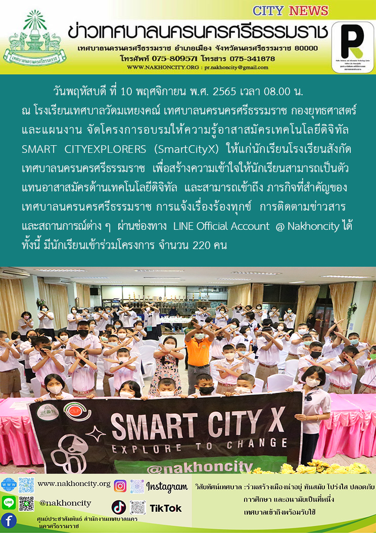 วันพฤหัสบดี ที่ 10 พฤศจิกายน พ.ศ. 2565 เวลา 08.00 น. ณ โรงเรียนเทศบาลวัดมเหยงคณ์เทศบาลนครนครศรีธรรมราช กองยุทธศาสตร์และแผนงาน จัดโครงการอบรมให้ความรู้อาสาสมัครเทคโนโลยีดิจิทัล SMART CITY EXPLORERS (Smart City X)ให้แก่นักเรียนโรงเรียนสังกัดเทศบาลนครนครศรีธรรมราช เพื่อสร้างความเข้าใจให้นักเรียนสามารถเป็นตัวแทนอาสาสมัครด้านเทคโนโลยีดิจิทัล และสามารถเข้าถึง ภารกิจที่สำคัญของเทศบาลนครนครศรีธรรมราช การแจ้งเรื่องร้องทุกข์ การติดตามข่าวสาร และสถานการณ์ต่าง ๆ ผ่านช่องทาง LINE Official Account @Nakhoncity ได้ ทั้งนี้ มีนักเรียนเข้าร่วมโครงการ จำนวน 220 คน
