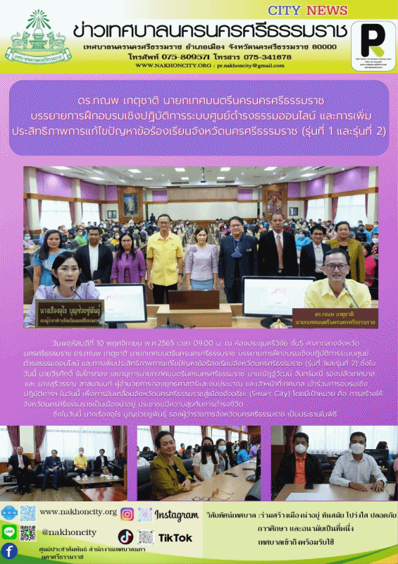 วันพฤหัสบดีที่ 10 พฤศจิกายน พ.ศ.2565 เวลา 09.00 น. ณ ห้องประชุมศรีวิชัย ชั้น5 ศาลากลางจังหวัดนครศรีธรรมราช ดร.กณพ เกตุชาติ นายกเทศมนตรีนครนครศรีธรรมราช บรรยายการฝึกอบรมเชิงปฏิบัติการระบบศูนย์ดำรงธรรมออนไลน์ และการเพิ่มประสิทธิภาพการแก้ไขปัญหาข้อร้องเรียนจังหวัดนครศรีธรรมราช (รุ่นที่ 1และรุ่นที่ 2) ซึ่งในวันนี้ นายวีรศักดิ์ รับไทรทอง เลขานุการนายกเทศมนตรีนครนครศรีธรรมราช นายณัฏฐ์วัฒน์ จันทร์มณี รองปลัดเทศบาล และ นางสุรีวรรณ สาสนานนท์ ผู้อำนวยการกองยุทธศาสตร์และงบประมาณ และเจ้าหน้าที่เทศบาล เข้าร่วมการอบรมเชิงปฏิบัติการฯ ในวันนี้ เพื่อการขับเคลื่อนจังหวัดนครศรีธรรมราชสู่เมืองอัจฉริยะ (Smart City) โดยมีเป้าหมาย คือ การสร้างให้จังหวัดนครศรีธรรมราชเป็นเมืองน่าอยู่ ประชาชนมีความสุขกับการดำรงชีวิต ซึ่งในวันนี้ นางเรืองอุไร บูญช่วยชูพันธุ์ รองผู้ว่าราชการจังหวัดนครศรีธรรมราช เป็นประธานในพิธี .................. ภาพ//ข่าว//จันทร์จิรา ตรวจทาน//ฐิตินันท์ |