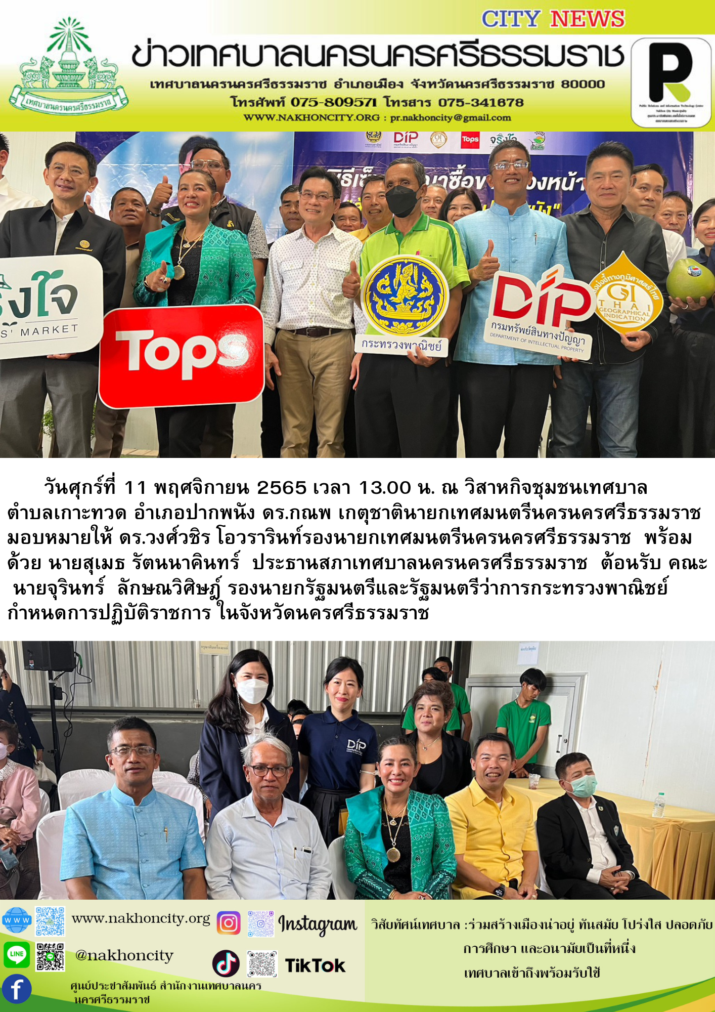 วันศุกร์ที่ 11 พฤศจิกายน 2565 เวลา 13.00 น. ณ วิสาหกิจชุมชนเทศบาลตำบลเกาะทวด อำเภอปากพนัง ดร.กณพ เกตุชาติ นายกเทศมนตรีนครนครศรีธรรมราช มอบหมายให้ ดร.วงศ์วชิร โอวรารินท์ รองนายกเทศมนตรีนครนครศรีธรรมราช พร้อมด้วย นายสุเมธ รัตนนาคินทร์ ประธานสภาเทศบาลนครนครศรีธรรมราช ต้อนรับ นายจุรินทร์ ลักษณวิศิษฎ์ รองนายกรัฐมนตรีและรัฐมนตรีว่าการกระทรวงพาณิชย์ กำหนดการปฏิบัติราชการ ในจังหวัดนครศรีธรรมราช |