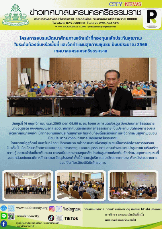 นายอนุสรณ์ พงษ์เกษมพรกุล รองนายกเทศมนตรีนครนครศรีธรรมราช เป็นประธานเปิดโครงการอบรมพัฒนาศักยภาพเจ้าหน้าที่กองทุนหลักประกันสุขภาพ ในระดับท้องถิ่นหรือพื้นที่ และจัดทำแผนสุขภาพชุมชน ปีงบประมาณ 2566 เทศบาลนครนครศรีธรรมราช |