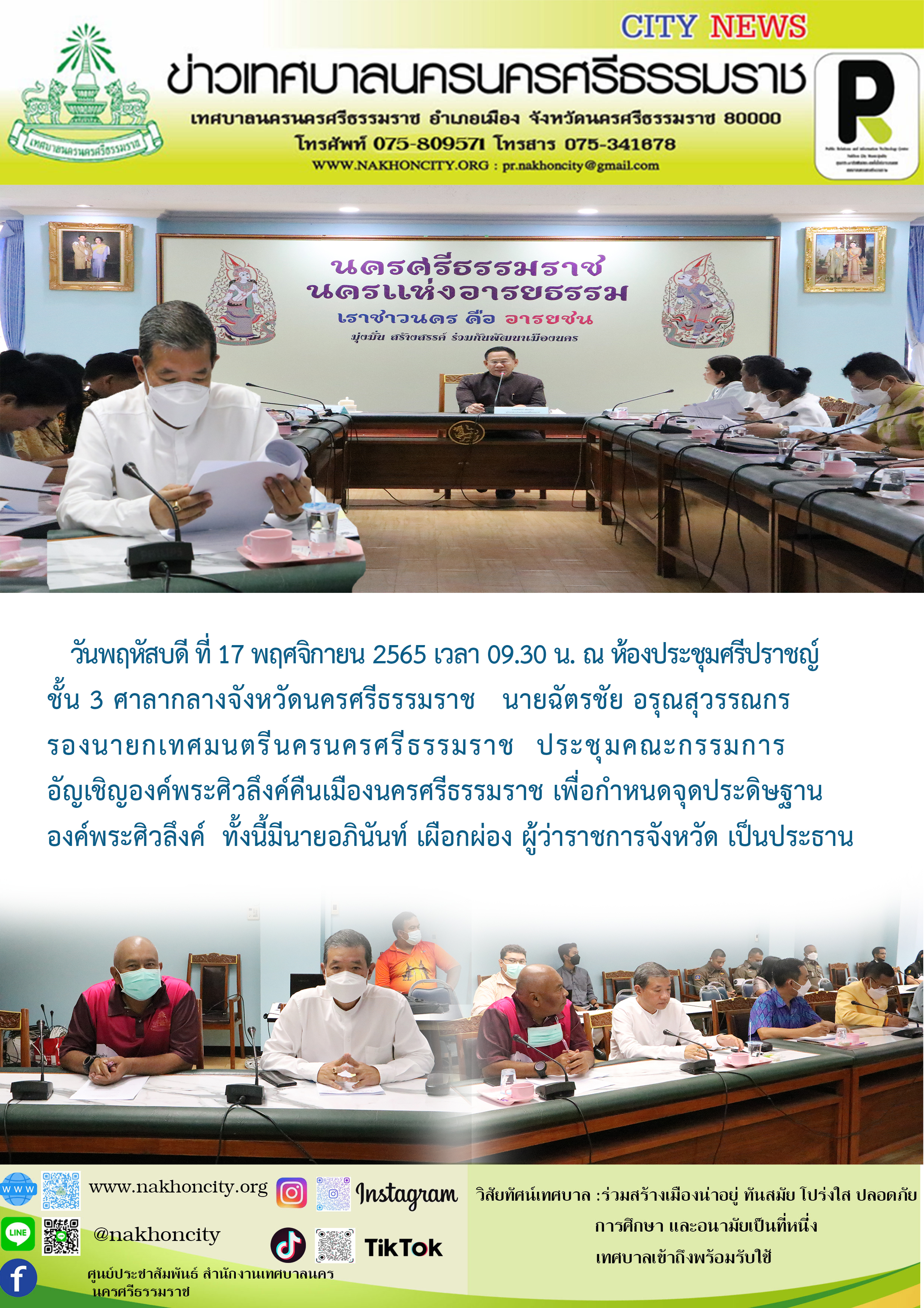 วันพฤหัสบดี ที่ 17 พฤศจิกายน 2565 เวลา 09.30 น. ณ ห้องประชุมศรีปราชญ์ ชั้น 3 ศาลากลางจังหวัดนครศรีธรรมราช นายฉัตรชัย อรุณสุวรรณกร รองนายกเทศมนตรีนครนครศรีธรรมราช ประชุมคณะกรรมการอัญเชิญองค์พระศิวลึงค์คืนเมืองนครศรีธรรมราช เพื่อกำหนดจุดประดิษฐานองค์พระศิวลึงค์ ทั้งนี้มีนายอภินันท์ เผือกผ่อง ผู้ว่าราชการจังหวัด เป็นประธาน
