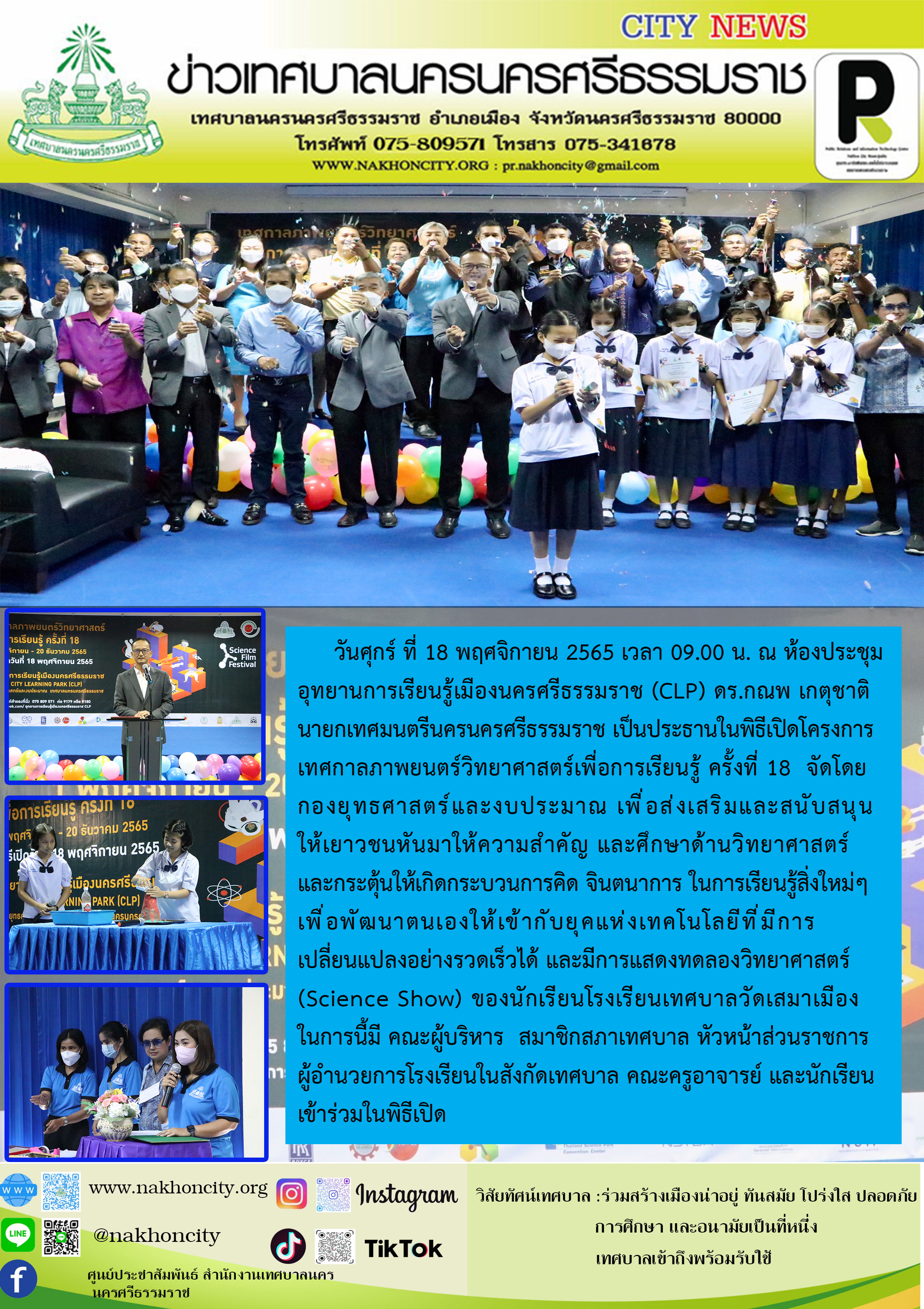วันศุกร์ ที่ 18 พฤศจิกายน 2565 เวลา 09.00 น. ณ ห้องประชุม อุทยานการเรียนรู้เมืองนครศรีธรรมราช (CLP) ดร.กณพ เกตุชาติ นายกเทศมนตรีนครนครศรีธรรมราช เป็นประธานในพิธีเปิด โครงการเทศกาลภาพยนตร์วิทยาศาสตร์เพื่อการเรียนรู้ ครั้งที่ 18 จัดโดยกองยุทธศาสตร์และงบประมาณ เพื่อส่งเสริมและสนับสนุน ให้เยาวชนหันมาให้ความสําคัญ และศึกษาด้านวิทยาศาสตร์ และกระตุ้นให้เกิดกระบวนการคิด จินตนาการ ในการเรียนรู้สิ่งใหม่ๆ เพื่อพัฒนาตนเองให้เข้ากับยุคแห่งเทคโนโลยีที่มีการ เปลี่ยนแปลงอย่างรวดเร็วได้ และมีการแสดงทดลองวิทยาศาสตร์ (Science Show) ของนักเรียนโรงเรียนเทศบาลวัดเสมาเมืองในการนี้มี คณะผู้บริหาร สมาชิกสภาเทศบาล หัวหน้าส่วนราชการ ผู้อํานวยการโรงเรียนในสังกัดเทศบาล คณะครูอาจารย์ และนักเรียน เข้าร่วมในพิธีเปิด