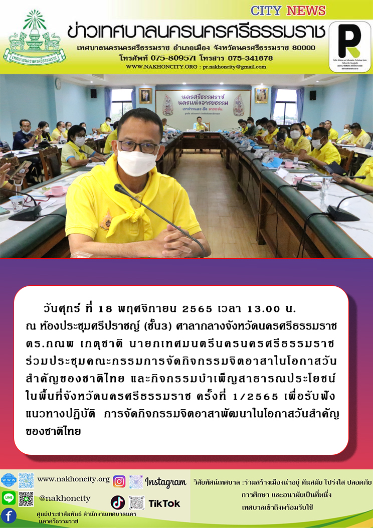 วันศุกร์ ที่ 18 พฤศจิกายน 2565 เวลา 13.00 น. ณ ห้องประชุมศรีปราชญ์ (ชั้น3) ศาลากลางจังหวัดนครศรีธรรมราช ดร.กณพ เกตุชาติ นายกเทศมนตรีนครนครศรีธรรมราช ร่วมประชุมคณะกรรมการจัดกิจกรรมจิตอาสาในโอกาสวันสำคัญของชาติไทย และกิจกรรมบำเพ็ญสาธารณประโยชน์ ในพื้นที่จังหวัดนครศรีธรรมราช ครั้งที่ 1/2565 เพื่อรับฟัง แนวทางปฎิบัติ การจัดกิจกรรมจิตอาสาพัฒนาในโอกาสวันสำคัญของชาติไทย