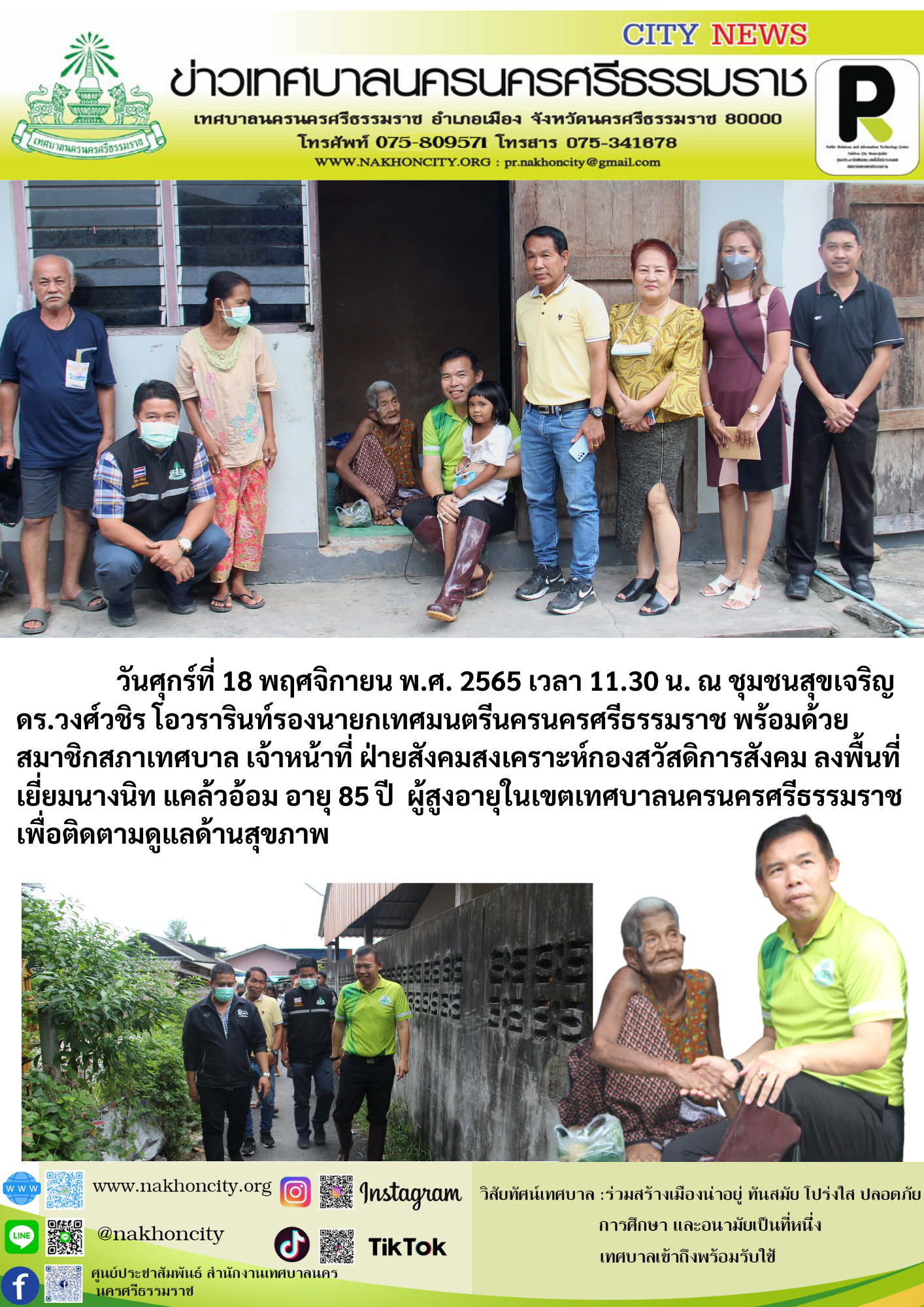 วันศุกร์ที่ 18 พฤศจิกายน พ.ศ. 2565 เวลา 11.30 น. ณ ชุมชนสุขเจริญ ( ซอยต้นหว้า )ดร.วงศ์วชิร โอวรารินท์ รองนายกเทศมนตรีนครนครศรีธรรมราช พร้อมด้วย สมาชิกสภาเทศบาล เจ้าหน้าที่ ฝ่ายสังคมสงเคราะห์กองสวัสดิการสังคม ลงพื้นที่ เยี่ยมนางนิท แคล้วอ้อม อายุ 85 ปี ผู้สูงอายุในเขตเทศบาลนครนครศรีธรรมราช เพื่อติดตามดูแลด้านสุขภาพ |