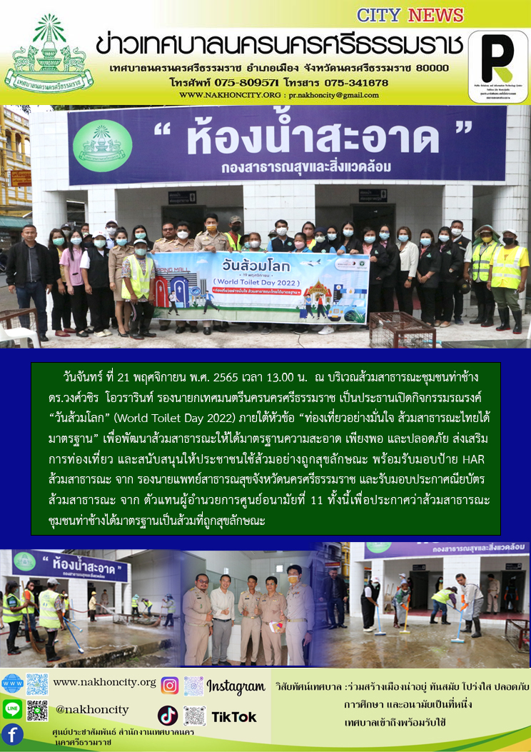 วันจันทร์ ที่ 21 พฤศจิกายน พ.ศ. 2565 เวลา 13.00 น. ณ บริเวณส้วมสาธารณะชุมชนท่าช้าง ดร.วงศ์วชิร โอวรารินท์ รองนายกเทศมนตรีนครนครศรีธรรมราช เป็นประธานเปิดกิจกรรมรณรงค์ “วันส้วมโลก” (World Toilet Day 2022) ภายใต้หัวข้อ “ท่องเที่ยวอย่างมั่นใจ ส้วมสาธารณะไทยได้มาตรฐาน” เพื่อพัฒนาส้วมสาธารณะให้ได้มาตรฐานความสะอาด เพียงพอ และปลอดภัย ส่งเสริมการท่องเที่ยว และสนับสนุนให้ประชาชนใช้ส้วมอย่างถูกสุขลักษณะ พร้อมรับมอบป้าย HAR ส้วมสาธารณะ จาก รองนายแพทย์สาธารณสุขจังหวัดนครศรีธรรมราช และรับมอบประกาศณียบัตร ส้วมสาธารณะ จาก ตัวแทนผู้อำนวยการศูนย์อนามัยที่ 11 ทั้งนี้เพื่อประกาศว่าส้วมสาธารณะชุมชนท่าช้างได้มาตรฐานเป็นส้วมที่ถูกสุขลักษณะ