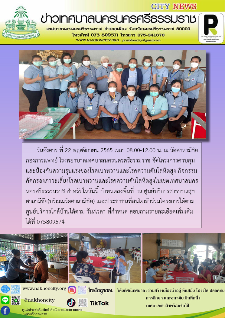 วันอังคาร ที่ 22 พฤศจิกายน 2565 เวลา 08.00-12.00 น. ณ วัดศาลามีชัย กองการแพทย์ โรงพยาบาลเทศบาลนครนครศรีธรรมราช จัดโครงการควบคุมและป้องกันความรุนแรงของโรคเบาหวานและโรคความดันโลหิตสูง กิจกรรมคัดกรองภาวะเสี่ยงโรคเบาหวานและโรคความดันโลหิตสูงในเขตเทศบาลนครนครศรีธรรรมราช สำหรับในวันนี้ กำหนดลงพื้นที่ ณ ศูนย์บริการสาธารณสุข ศาลามีชัย(บริเวณวัดศาลามีชัย) และประชาชนที่สนใจเข้าร่วมโครงการได้ตามศูนย์บริการใกล้บ้านได้ตาม วัน/เวลา ที่กำหนด สอบถามรายละเอียดเพิ่มเติมได้ที่ 075809574 หรือ https://www.facebook.com/NKCHOS