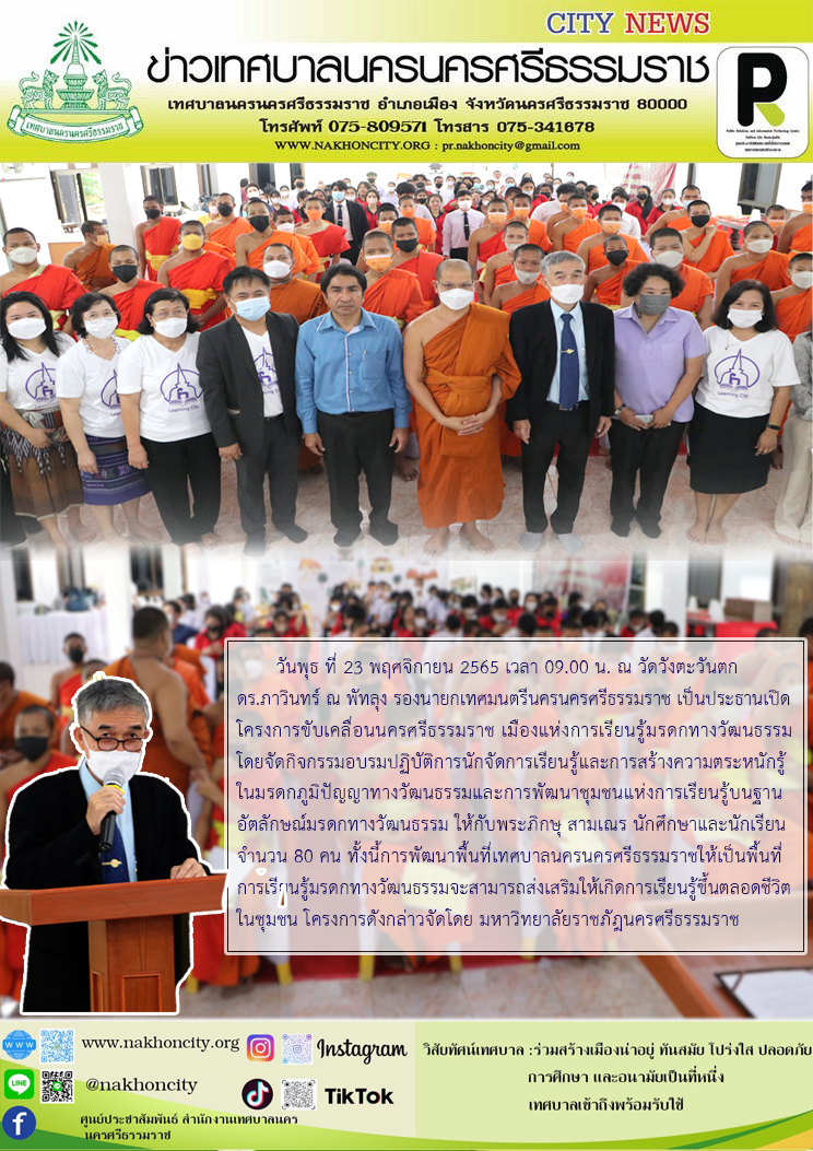 วันพุธ ที่ 23 พฤศจิกายน 2565 เวลา 09.00 น. ณ วัดวังตะวันตก ดร.ภาวินทร์ ณ พัทลุง รองนายกเทศมนตรีนครนครศรีธรรมราช เป็นประธานเปิดโครงการขับเคลื่อนนครศรีธรรมราช เมืองแห่งการเรียนรู้มรดกทางวัฒนธรรม โดยจัดกิจกรรมอบรมปฏิบัติการนักจัดการเรียนรู้และการสร้างความตระหนักรู้ในมรดกภูมิปัญญาทางวัฒนธรรมและการพัฒนาชุมชนแห่งการเรียนรู้บนฐานอัตลักษณ์มรดกทางวัฒนธรรม ให้กับพระภิกษุ สามเณร นักศึกษาและนักเรียน จำนวน 80 คน ทั้งนี้การพัฒนาพื้นที่เทศบาลนครนครศรีธรรมราชให้เป็นพื้นที่การเรียนรู้มรดกทางวัฒนธรรมจะสามารถส่งเสริมให้เกิดการเรียนรู้ขึ้นตลอดชีวิตในชุมชน โครงการดังกล่าวจัดโดย มหาวิทยาลัยราชภัฎนครศรีธรรมราช