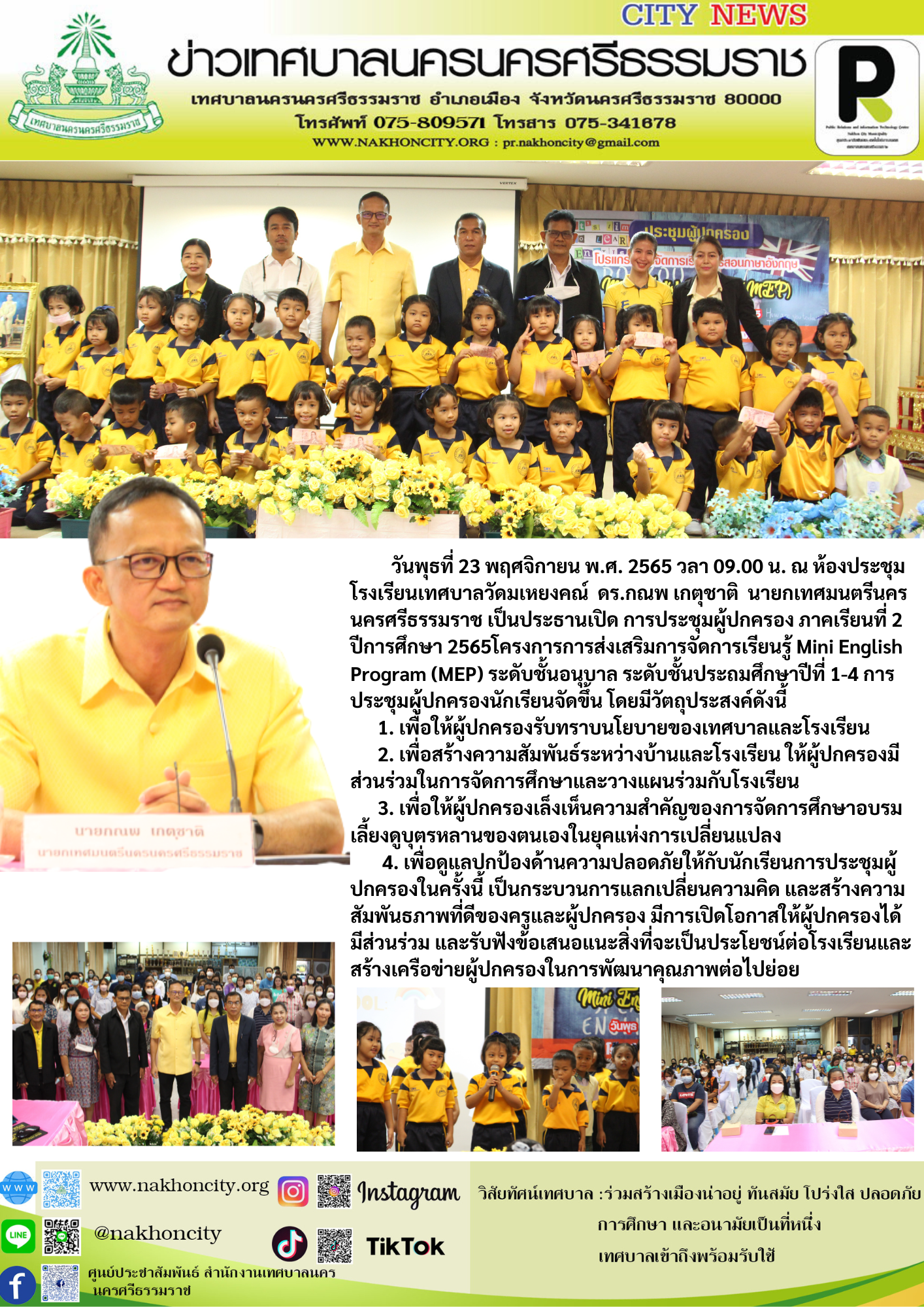 ดร.กณพ เกตุชาติ นายกเทศมนตรีนครนครศรีธรรมราช เป็นประธานเปิด การประชุมผู้ปกครอง ภาคเรียนที่ 2 ปีการศึกษา 2565โครงการการส่งเสริมการจัดการเรียนรู้ Mini English Program (MEP) ระดับชั้นอนุบาล ระดับชั้นประถมศึกษาปีที่ 1-4 |