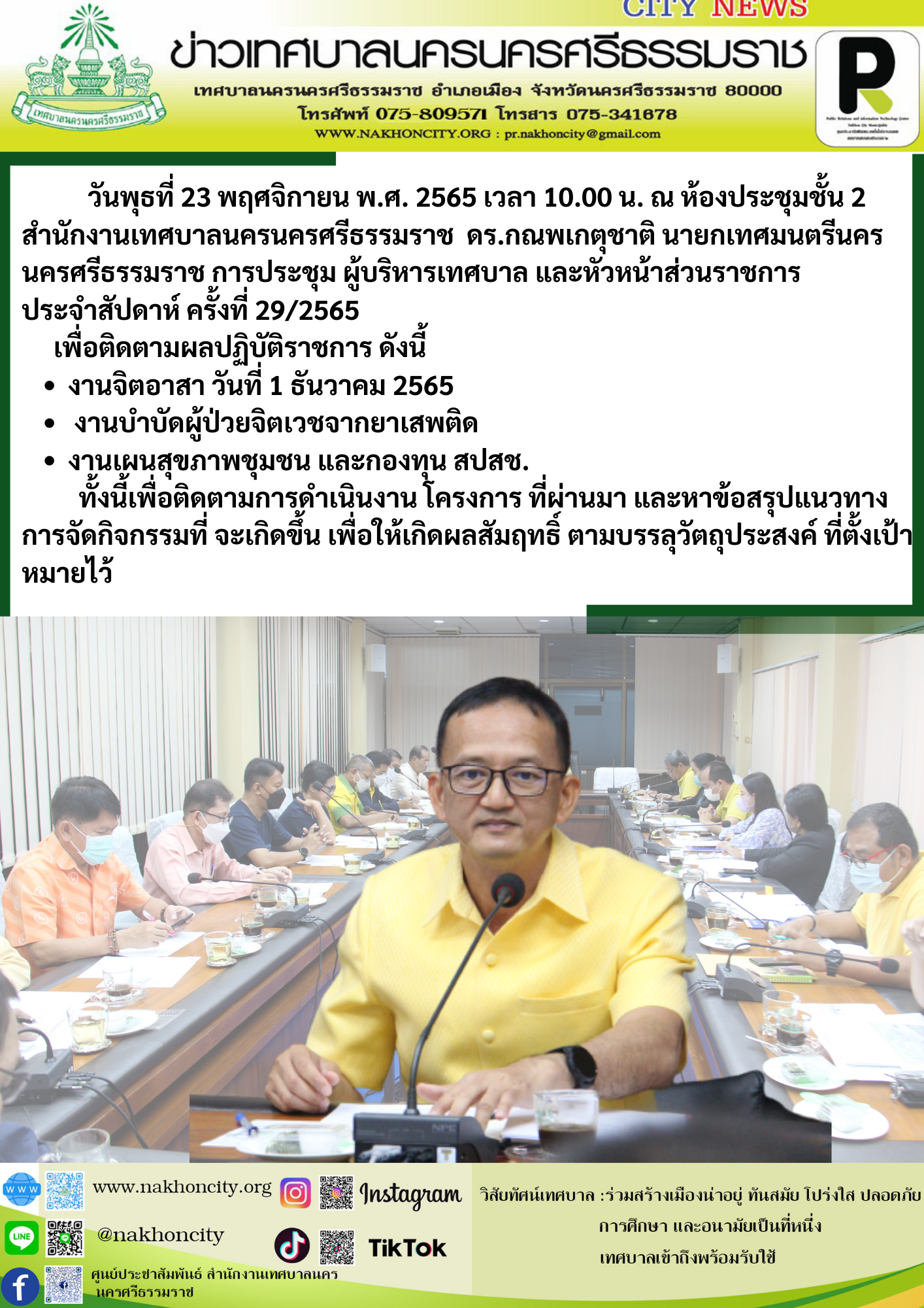 วันพุธที่ 23 พฤศจิกายน พ.ศ. 2565 เวลา 10.00 น. ณ ห้องประชุมชั้น 2 สำนักงานเทศบาลนครนครศรีธรรมราช ดร.กณพ เกตุชาติ นายกเทศมนตรีนครนครศรีธรรมราช การประชุม ผู้บริหารเทศบาล และหัวหน้าส่วนราชการ ประจำสัปดาห์ ครั้งที่ 29/2565 เพื่อติดตามผลปฏิบัติราชการ ดังนี้