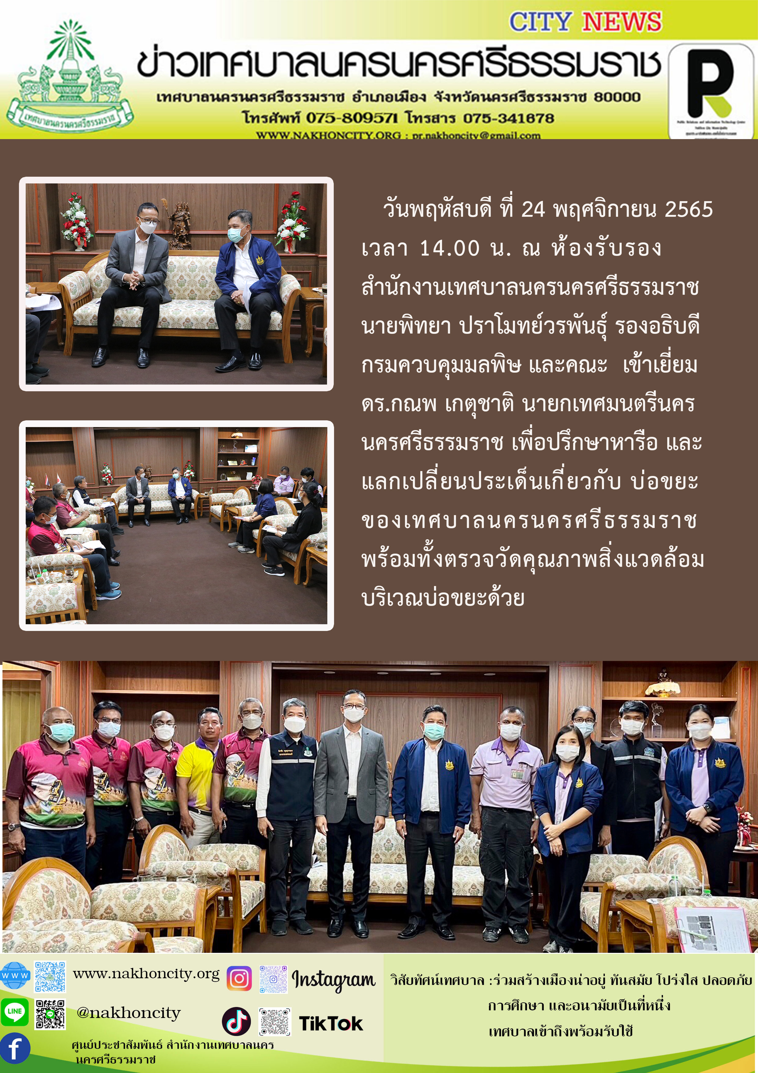 วันพฤหัสบดี ที่ 24 พฤศจิกายน 2565 เวลา 14.00 น. ณ ห้องรับรอง สำนักงานเทศบาลนคร นครศรีธรรมราช นายพิทยา ปราโมทย์วรพันธุ์ รองอธิบดีกรมควบคุมมลพิษ และคณะ เข้าเยี่ยม ดร.กณพ เกตุชาติ นายกเทศมนตรีนครนครศรีธรรมราช เพื่อปรึกษาหารือ และแลกเปลี่ยนประเด็นเกี่ยวกับบ่อขยะของเทศบาลนครนครศรีธรรมราช พร้อมทั้งตรวจวัดคุณภาพสิ่งแวดล้อมบริเวณบ่อขยะด้วย