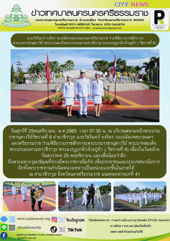 นายวัชรินทร์ จงจิตร รองปลัดเทศบาลนครนครศรีธรรมราช ร่วมพิธีถวายราชสักการะพระบรมราชานุสาวรีย์ พระบาทสมเด็จพระปรเมนทรมหาวชิราวุธ พระมงกุฎเกล้าเจ้าอยู่หัว ( รัชกาลที่ 6) |