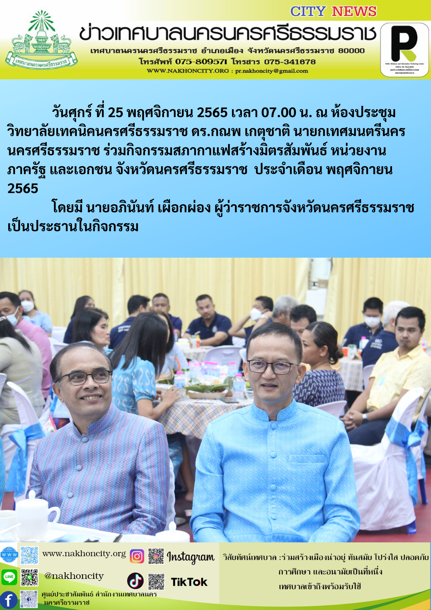 วันศุกร์ ที่ 25 พฤศจิกายน 2565 เวลา 07.00 น. ณ ห้องประชุมวิทยาลัยเทคนิคนครศรีธรรมราช ดร.กณพ เกตุชาติ นายกเทศมนตรีนครนครศรีธรรมราช ร่วมกิจกรรมสภากาแฟสร้างมิตรสัมพันธ์ หน่วยงานภาครัฐ และเอกชน จังหวัดนครศรีธรรมราช ประจำเดือน พฤศจิกายน 2565 โดยมี นายอภินันท์ เผือกผ่อง ผู้ว่าราชการจังหวัดนครศรีธรรมราช เป็นประธานในกิจกรรม