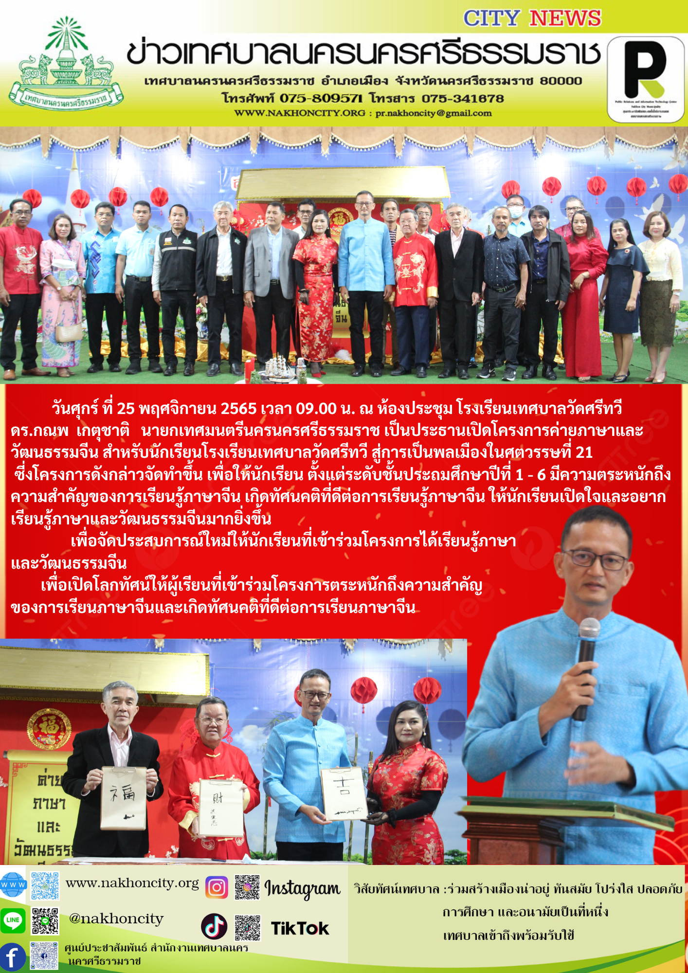วันศุกร์ ที่ 25 พฤศจิกายน 2565 เวลา 09.00 น. ณ ห้องประชุม โรงเรียนเทศบาลวัดศรีทวี ดร.กณพ เกตุชาติ นายกเทศมนตรีนครนครศรีธรรมราช เป็นประธานเปิดโครงการค่ายภาษาและวัฒนธรรมจีน สำหรับนักเรียนโรงเรียนเทศบาลวัดศรีทวี สู่การเป็นพลเมืองในศตวรรษที่ 21 ซี่งโครงการดังกล่าวจัดทำขึ้น เพื่อให้นักเรียน ตั้งแต่ระดับชั้นประถมศึกษาปีที่ 1 - 6 มีความตระหนักถึงความสำคัญของการเรียนรู้ภาษาจีน เกิดทัศนคติที่ดีต่อการเรียนรู้ภาษาจีน ให้นักเรียนเปิดใจและอยากเรียนรู้ภาษาและวัฒนธรรมจีนมากยิ่งขึ้น เพื่อจัดประสบการณ์ใหม่ให้นักเรียนที่เข้าร่วมโครงการได้เรียนรู้ภาษาและวัฒนธรรมจีน เพื่อเปิดโลกทัศน์ให้ผู้เรียนที่เข้าร่วมโครงการตระหนักถึงความสำคัญของการเรียนภาษาจีนและเกิดทัศนคติที่ดีต่อการเรียนภาษาจีน