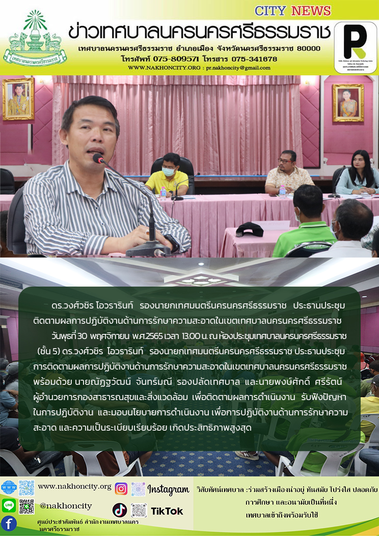 ดร.วงศ์วชิร โอวรารินท์ รองนายกเทศมนตรีนครนครศรีธรรมราช ประธานประชุมติดตามผลการปฏิบัติงานด้านการรักษาความสะอาดในเขตเทศบาลนครนครศรีธรรมราช |