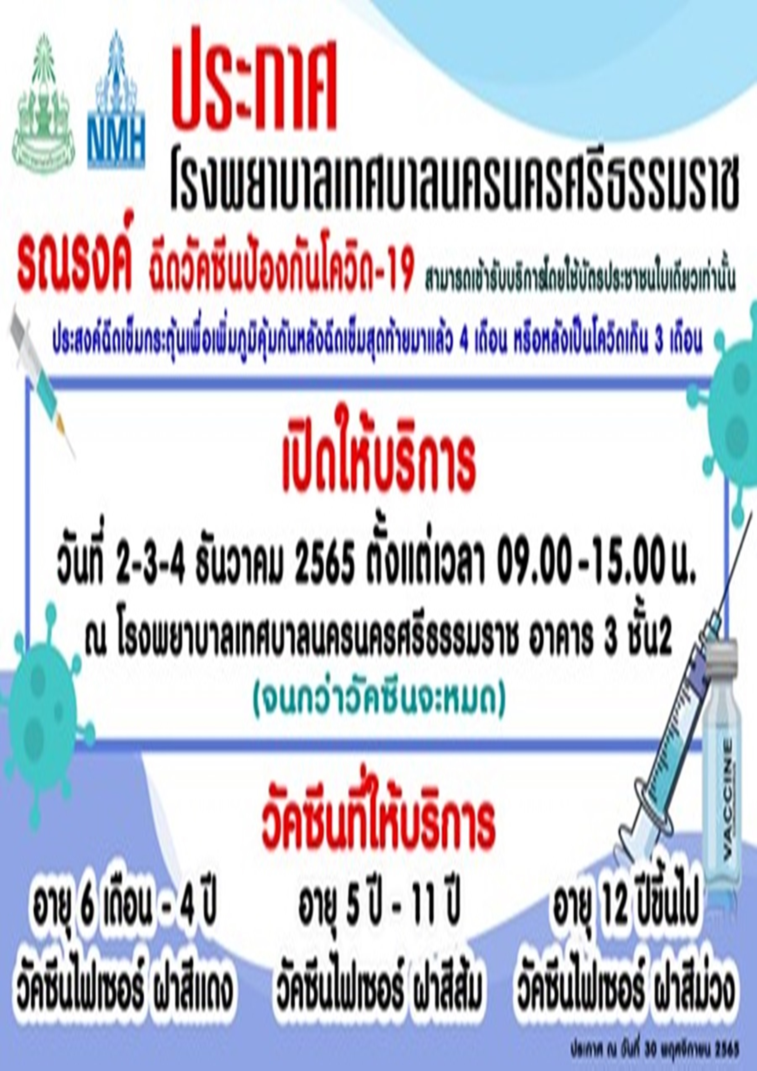 เทศบาลนครนครศรีธรรมราช ห่วงใยประชาชน รณรงค์ฉีดวัคซีนป้องกันโรคโควิด-19 เข็มกระตุ้น เพิ่มภูมิคุ้มกันหลังฉีดเข็มสุดท้ายมาแล้ว 4 เดือน และเพิ่มความปลอดภัยก่อนปีใหม่ |