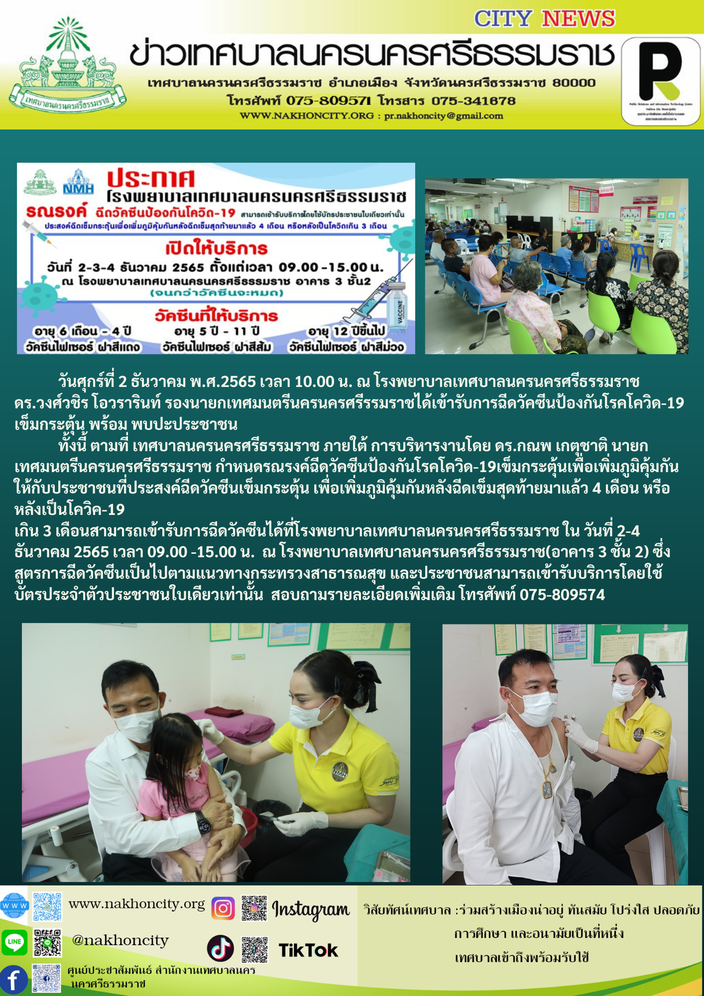 ดร.วงศ์วชิร โอวรารินท์ รองนายกเทศมนตรีนครนครศรีรรมราช พบปะประชาชนผู้เข้ารับการฉีดวัคซีนป้องกันโรคโควิด-19 วันศุกร์ที่ 2 ธันวาคม พ.ศ.2565 เวลา 10.00 น. ณ โรงพยาบาลเทศบาลนครนครศรีธรรมราช ดร.วงศ์วชิร โอวรารินท์ รองนายกเทศมนตรีนครนครศรีรรมราช ได้เข้ารับการฉีดวัคซีนป้องกันโรคโควิด-19 เข็มกระตุ้น พร้อม พบปะประชาชน ทั้งนี้ ตามที่ เทศบาลนครนครศรีธรรมราช ภายใต้ การบริหารงานโดย ดร.กณพ เกตุชาติ นายกเทศมนตรีนครนครศรีธรรมราช กำหนด รณรงค์ฉีดวัคซีนป้องกันโรคโควิด-19 เข็มกระตุ้น เพื่อเพิ่มภูมิคุ้มกันให้กับประชาชน ที่ประสงค์ฉีดวัคซีนเข็มกระตุ้น เพื่อเพิ่มภูมิคุ้มกันหลังฉีดเข็มสุดท้ายมาแล้ว 4 เดือน หรือ หลังเป็นโควิค-19 เกิน 3 เดือน สามารถเข้ารับการฉีดวัคซีนได้ที่ โรงพยาบาลเทศบาลนครนครศรีธรรมราช ใน วันที่ 2-4 ธันวาคม 2565 เวลา 09.00 -15.00 น. ณ โรงพยาบาลเทศบาลนครนครศรีธรรมราช (อาคาร 3 ชั้น 2) ซึ่งสูตรการฉีดวัคซีนเป็นไปตามแนวทางกระทรวงสาธารณสุข และประชาชนสามารถเข้ารับบริการโดยใช้บัตรประจำตัวประชาชนใบเดียวเท่านั้น สอบถามรายละเอียดเพิ่มเติม โทรศัพท์ 075-809574 |