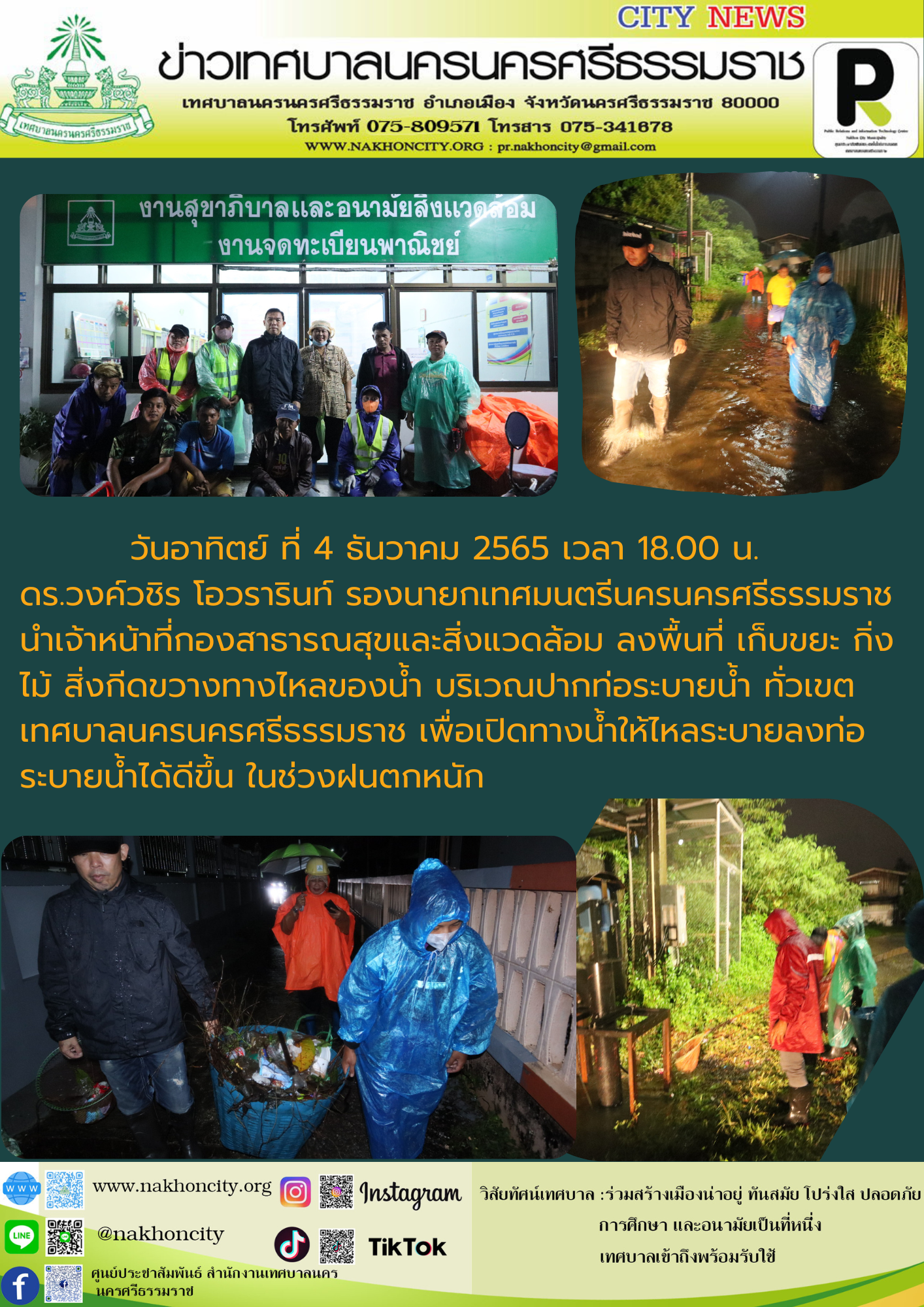 วันอาทิตย์ ที่ 4 ธันวาคม 2565 เวลา 18.00 น. ดร.วงค์วชิร โอวรารินท์ รองนายกเทศมนตรีนครนครศรีธรรมราช นำเจ้าหน้าที่กองสาธารณสุขและสิ่งแวดล้อม ลงพื้นที่ เก็บขยะ กิ่งไม้ สิ่งกีดขวางทางไหลของน้ำ บริเวณปากท่อระบายน้ำ ทั่วเขตเทศบาลนครนครศรีธรรมราช เพื่อเปิดทางน้ำให้ไหลระบายลงท่อระบายน้ำได้ดีขึ้น ในช่วงฝนตกหนัก |
