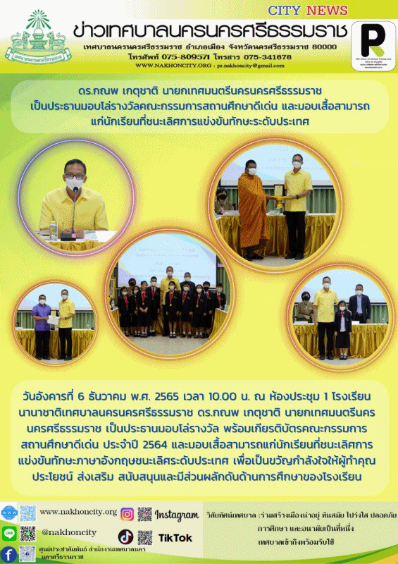 ดร.กณพ เกตุชาติ นายกเทศมนตรีนครนครศรีธรรมราช เป็นประธานมอบโล่รางวัลคณะกรรมการสถานศึกษาดีเด่น และมอบเสื้อสามารถแก่นักเรียนที่ชนะเลิศการแข่งขันทักษะระดับประเทศ |