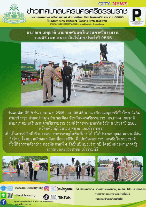 ดร.กณพ เกตุชาติ นายกเทศมนตรีนครนครศรีธรรมราช ร่วมพิธีวางพวงมาลาวันวีรไทย ประจำปี 2565 |