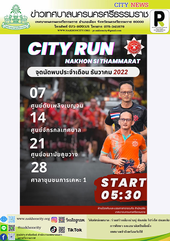 ฝ่ายป้องกันและบรรเทาสาธารณภัย สำนักปลัดเทศบาล เทศบาลนครนครศรีธรรมราช จัดกิจกรรม วิ่งออกกำลังกาย " CITY RUN " ทุกวันพุธ ประจำเดือนธันวาคม 2565 |