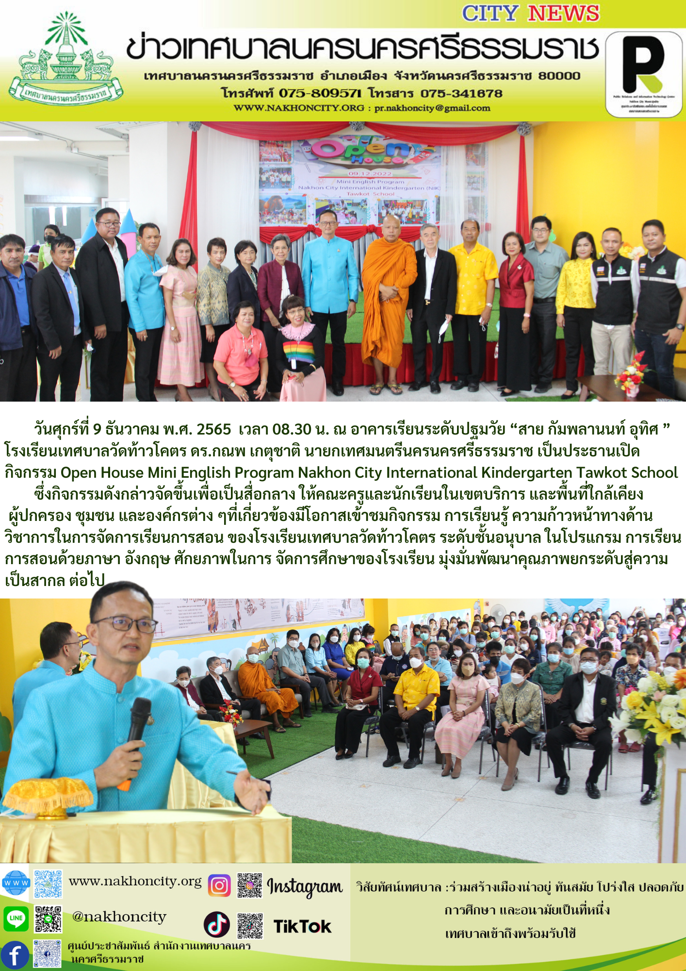 วันศุกร์ที่ 9 ธันวาคม พ.ศ. 2565 เวลา 08.30 น. ณ อาคารเรียนระดับปฐมวัย “สาย กัมพลานนท์ อุทิศ ” โรงเรียนเทศบาลวัดท้าวโคตร ดร.กณพ เกตุชาติ นายกเทศมนตรีนครนครศรีธรรมราช เป็นประธานเปิด กิจกรรม Open House Mini English Program Nakhon City International Kindergarten Tawkot School ซึ่งกิจกรรมดังกล่าวจัดขึ้นเพื่อเป็นสื่อกลาง ให้คณะครูและนักเรียนในเขตบริการ และพื้นที่ใกล้เคียง ผู้ปกครอง ชุมชน และองค์กรต่าง ๆที่เกี่ยวข้องมีโอกาสเข้าชมกิจกรรม การเรียนรู้ ความก้าวหน้าทางด้านวิชาการในการจัดการเรียนการสอน ของโรงเรียนเทศบาลวัดท้าวโคตร ระดับชั้นอนุบาล ในโปรแกรม การเรียนการสอนด้วยภาษา อังกฤษ ศักยภาพในการ จัดการศึกษาของโรงเรียน มุ่งมั่นพัฒนาคุณภาพยกระดับสู่ความเป็นสากล ต่อไป