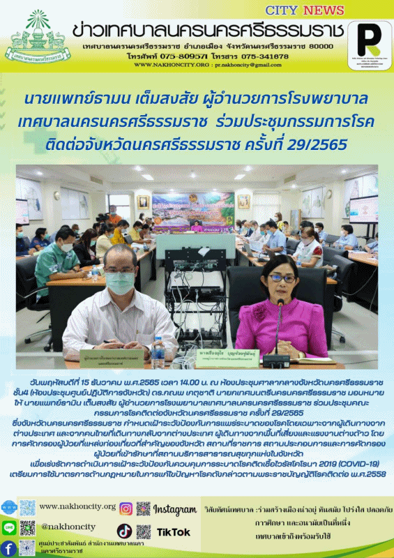 วันพฤหัสบดีที่ 15 ธันวาคม พ.ศ.2565 เวลา 14.00 น. ณ ห้องประชุมศาลากลางจังหวัดนครศรีธรรมราช ชั้น4 (ห้องประชุมศูนย์ปฏิบัติการจังหวัด) ดร.กณพ เกตุชาติ นายกเทศมนตรีนครนครศรีธรรมราช มอบหมายให้ นายแพทย์ธามิน เต็มสงสัย ผู้อำนวยการโรงพยาบาลเทศบาลนครนครศรีธรรมราช ร่วมประชุมคณะกรรมการโรคติดต่อจังหวัดนครศรีธรรมราช ครั้งที่ 29/2565 ซึ่งจังหวัดนครนครศรีธรรมราช กำหนดเฝ้าระวังป้องกันการแพร่ระบาดของโรคโดยเฉพาะจากผู้เดินทางจากต่างประเทศ และจากคนไทยที่เดินทางกลับจากต่างประเทศ ผู้เดินทางจากพื้นที่เสี่ยงและแรงงานต่างด้าว โดยการคัดกรองผู้ป่วยที่แหล่งท่องเที่ยวที่สำคัญของจังหวัด สถานที่ราชการ สถานประกอบการและการคัดกรองผู้ป่วยที่เข้ารักษาที่สถานบริการสาธารณสุขทุกแห่งในจังหวัด เพื่อเร่งรัดการดำเนินการเฝ้าระวังป้องกันควบคุมการระบาดโรคติดเชื้อไวรัสโคโรนา 2019 (COVID-19) เตรียมการใช้มาตรการด้านกฎหมายในการแก้ไขปัญหาโรคดังกล่าวตามพระราชบัญญัติโรคติดต่อ พ.ศ.2558 ............... ภาพ//ข่าว//จันทร์จิรา |