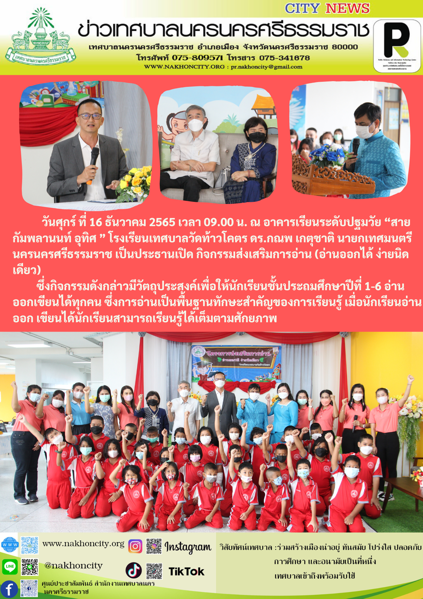 วันศุกร์ ที่ 16 ธันวาคม 2565 เวลา 09.00 น. ณ อาคารเรียนระดับปฐมวัย “สาย กัมพลานนท์ อุทิศ ” โรงเรียนเทศบาลวัดท้าวโคตร ดร.กณพ เกตุชาติ นายกเทศมนตรีนครนครศรีธรรมราช เป็นประธานเปิด กิจกรรมส่งเสริมการอ่าน (อ่านออกได้ ง่ายนิดเดียว) ซึ่งกิจกรรมดังกล่าวมีวัตถุประสงค์เพื่อให้นักเรียนชั้นประถมศึกษาปีที่ 1-6 อ่านออกเขียนได้ทุกคน ซึ่งการอ่านเป็นพื้นฐานทักษะสำคัญของการเรียนรู้ เมื่อนักเรียนอ่านออก เขียนได้นักเรียนสามารถเรียนรู้ได้เต็มตามศักยภาพ