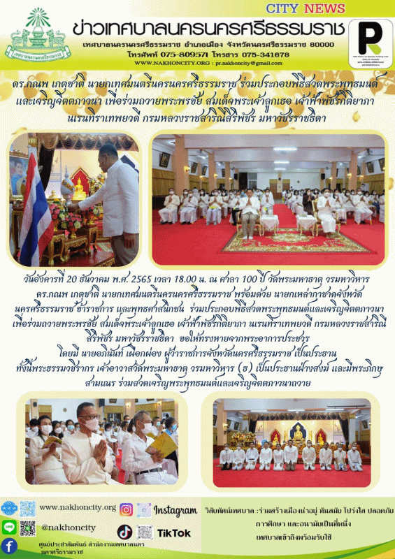 ดร.กณพ เกตุชาติ นายกเทศมนตรีนครนครศรีธรรมราช ร่วมประกอบพิธีสวดพระพุทธมนต์และเจริญจิตตภาวนา เพื่อร่วมถวายพระพรชัย สมเด็จพระเจ้าลูกเธอ เจ้าฟ้าพัชรกิติยาภา นเรนทิราเทพยวดี กรมหลวงราชสาริณีสิริพัชร มหาวัชรราชธิดา |