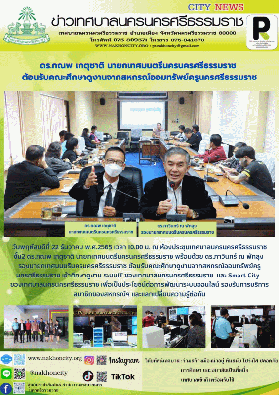 วันพฤหัสบดีที่ 22 ธันวาคม พ.ศ.2565 เวลา 10.00 น. ณ ห้องประชุมเทศบาลนครนครศรีธรรมราช ชั้น2 ดร.กณพ เกตุชาติ นายกเทศมนตรีนครนครศรีธรรมราช พร้อมด้วย ดร.ภาวินทร์ ณ พัทลุง รองนายกเทศมนตรีนครนครศรีธรรมราช ต้อนรับคณะศึกษาดูงานจากสหกรณ์ออมทรัพย์ครูนครศรีธรรมราช เข้าศึกษาดูงาน ระบบIT ของเทศบาลนครนครศรีธรรมราช และ Smart City ของเทศบาลนครนครศรีธรรมราช เพื่อเป็นประโยชน์ต่อการพัฒนาระบบออนไลน์ รองรับการบริการสมาชิกของสหกรณ์ฯ และแลกเปลี่ยนความรู้ต่อกัน ................. ภาพ//ข่าว//จันทร์จิรา ตรวจทาน//ฐิตินันท์ |
