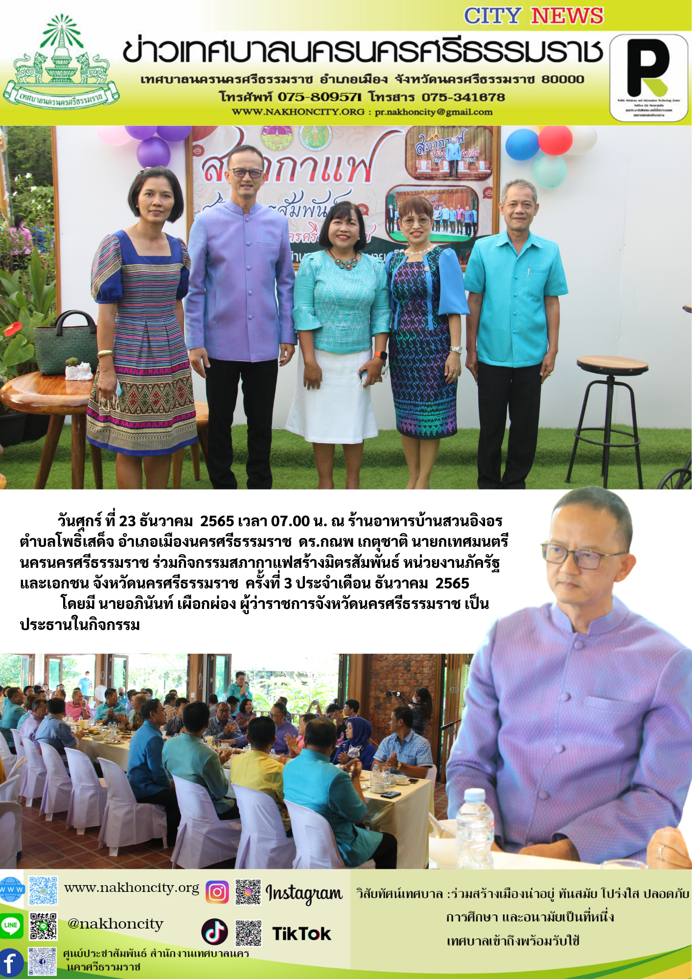 วันศุกร์ ที่ 23 ธันวาคม 2565 เวลา 07.00 น. ณ ร้านอาหารบ้านสวนอิงอร ตำบลโพธิ์เสด็จ อำเภอเมืองนครศรีธรรมราช ดร.กณพ เกตุชาติ นายกเทศมนตรีนครนครศรีธรรมราช ร่วมกิจกรรมสภากาแฟสร้างมิตรสัมพันธ์ หน่วยงานภัครัฐ และเอกชน จังหวัดนครศรีธรรมราช ครั้งที่ 3 ประจำเดือน ธันวาคม 2565 โดยมี นายอภินันท์ เผือกผ่อง ผู้ว่าราชการจังหวัดนครศรีธรรมราช เป็นประธานในกิจกรรม