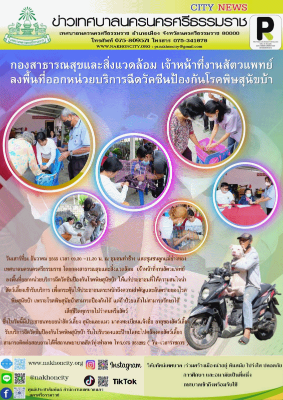 วันเสาร์ที่24 ธันวาคม 2565 เวลา 09.30 -11.30 น. ณ ชุมชนท่าช้าง และชุมชนลูกแม่อ่างทอง เทศบาลนครนครศรีธรรมราช โดยกองสาธารณสุขและสิ่งแวดล้อม เจ้าหน้าที่งานสัตวแพทย์ ลงพื้นที่ออกหน่วยบริการฉีดวัคซีนป้องกันโรคพิษสุนัขบ้า ให้แก่ประชาชนที่ให้ความสนใจนำสัตว์เลี้ยงเข้ารับบริการ เพื่อกระตุ้นให้ประชาชนตระหนักถึงความสำคัญและอันตรายของโรคพิษสุนัขบ้า เพราะโรคพิษสุนัขบ้าสามารถป้องกันได้ แต่ถ้าป่วยแล้วไม่สามารถรักษาได้ เสียชีวิตทุกรายไม่ว่าคนหรือสัตว์ ซึ่งในวันนี้มีประชาชนทยอยนำสัตว์เลี้ยง สุนัขและแมว มาลงทะเบียนแจ้งชื่อ อายุของสัตว์เลี้ยงรับบริการฉีดวัคซีนป้องกันโรคพิษสุนัขบ้า รับใบรับรองและป้ายโลหะไปคล้องคอสัตว์เลี้ยง สามารถติดต่อสอบถามได้ที่สถานพยาบาลสัตว์ทุ่งท่าลาด โทร.075 358292 ( วัน-เวลาราชการ ) ................... ภาพ//ข่าว//จันทร์จิรา |
