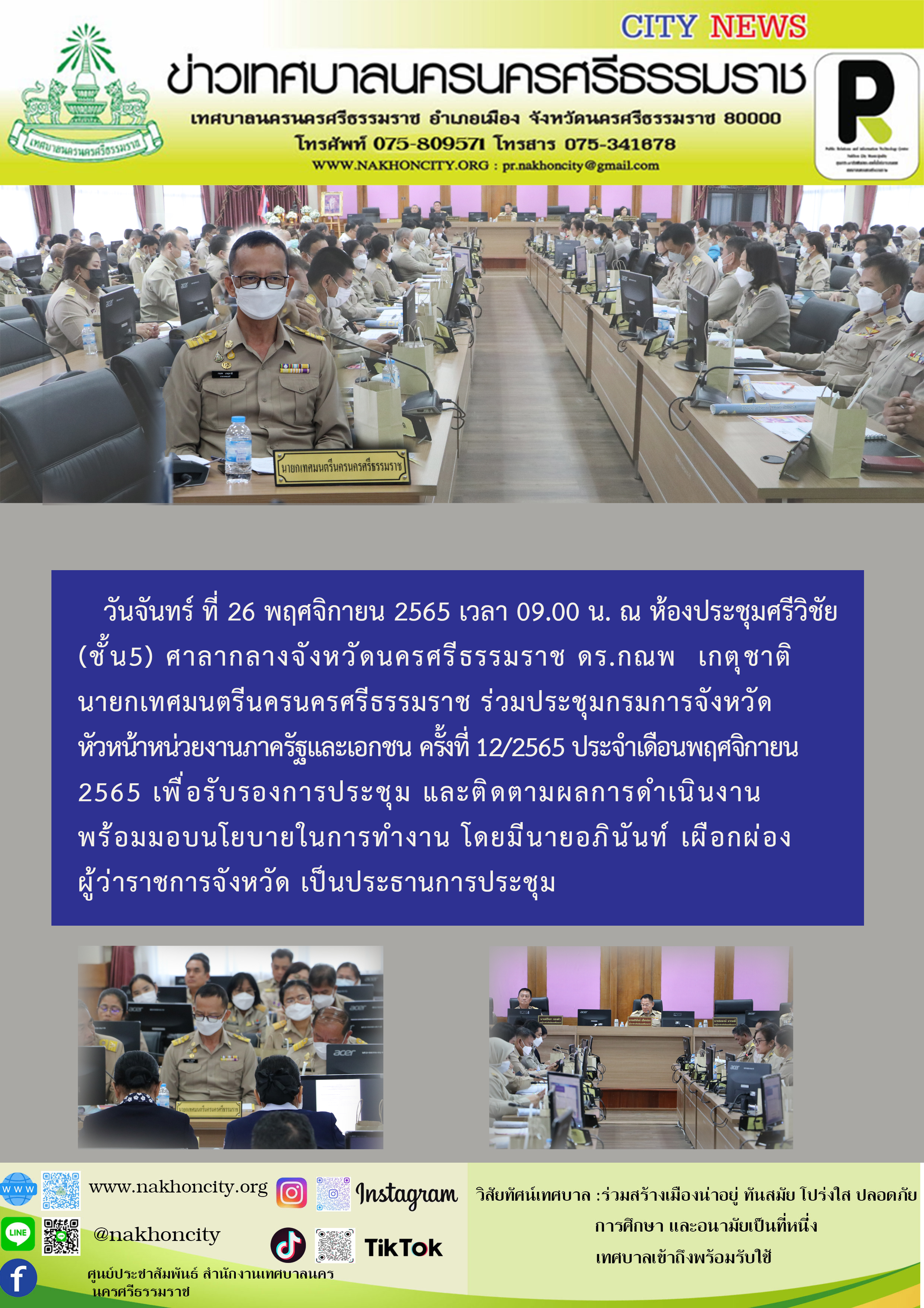 วันจันทร์ ที่ 26 พฤศจิกายน 2565 เวลา 09.00 น. ณ ห้องประชุมศรีวิชัย (ชั้น5) ศาลากลางจังหวัดนครศรีธรรมราช ภาพ//ข่าว//ไกรสิทธิ |