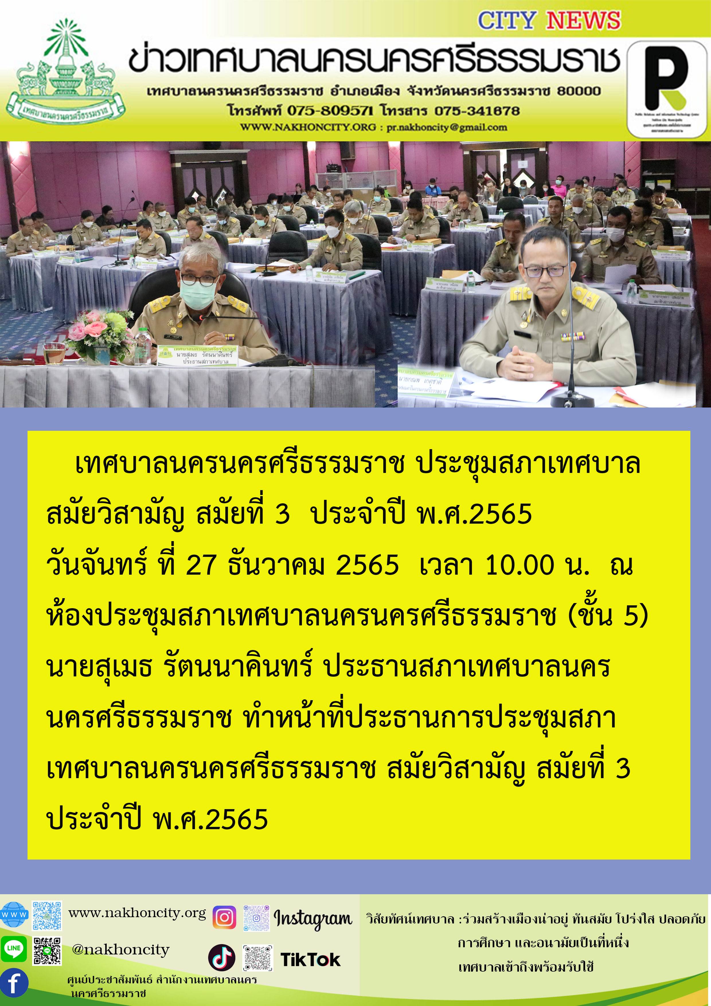 เทศบาลนครนครศรีธรรมราช ประชุมสภาเทศบาล วิสมัยสามัญ สมัยที่ 3 ประจำปี พ.ศ.2565 วันจันทร์ ที่ 27 ธันวาคม 2565 เวลา 10.00 น. ณ ห้องประชุมสภาเทศบาลนครนครศรีธรรมราช (ชั้น 5) นายสุเมธ รัตนนาคินทร์ ประธานสภาเทศบาลนครนครศรีธรรมราช ทำหน้าที่ประธานการประชุมสภาเทศบาลนครนครศรีธรรมราช สมัยสามัญ สมัยที่ 3 ประจำปี พ.ศ.2565 โดยมี ดร.กณพ เกตุชาติ นายกเทศมนตรีนครนครศรีธรรมราช พร้อมคณะผู้บริหาร สมาชิกสภาเทศบาล และหัวหน้าส่วนราชการ ร่วมประชุม ทั้งนี้มีระเบียบวาระการประชุม ดังนี้ ระเบียบวาระที่ 1 เรื่องที่ประธานสภาเทศบาลจะแจ้งให้ที่ประชุมทราบ
