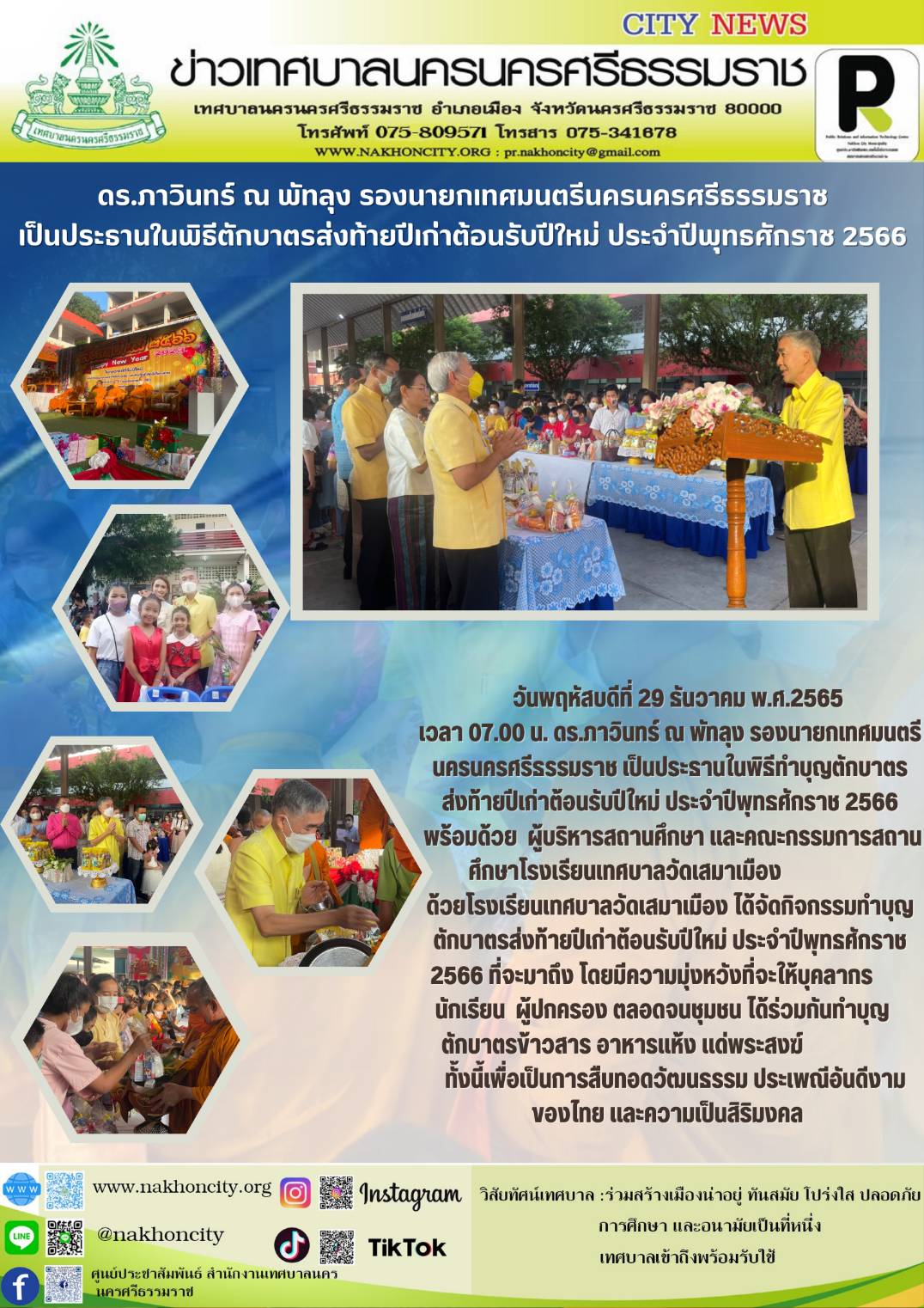 ดร.ภาวินทร์ ณ พัทลุง รองนายกเทศมนตรีนครนครศรีธรรมราช เป็นประธานในพิธีตักบาตรส่งท้ายปีเก่าต้อนรับปีใหม่ โรงเรียนเทศบาลวัดเสมาเมือง ประจำปีพุทธศักราช 2566 |