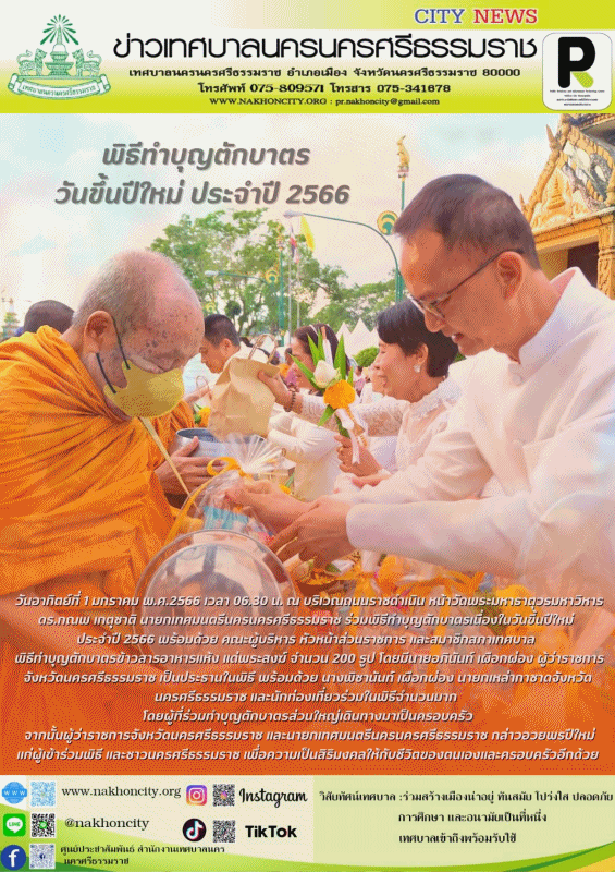 วันอาทิตย์ที่ 1 มกราคม พ.ศ.2566 เวลา 06.30 น. ณ บริเวณถนนราชดำเนิน หน้าวัดพระมหาธาตุวรมหาวิหาร ดร.กณพ เกตุชาติ นายกเทศมนตรีนครนครศรีธรรมราช ร่วมพิธีทำบุญตักบาตรเนื่องในวันขึ้นปีใหม่ ประจำปี 2566 พร้อมด้วย คณะผู้บริหาร หัวหน้าส่วนราชการ และสมาชิกสภาเทศบาลพิธีทำบุญตักบาตรข้าวสารอาหารแห้ง แด่พระสงฆ์ จำนวน 200 รูป โดยมีนายอภินันท์ เผือกผ่อง ผู้ว่าราชการจังหวัดนครศรีธรรมราช เป็นประธานในพิธี พร้อมด้วย นางพิชานันท์ เผือกผ่อง นายกเหล่ากาชาดจังหวัดนครศรีธรรมราช และนักท่องเที่ยวร่วมในพิธีจำนวนมาก โดยผู้ที่ร่วมทำบุญตักบาตรส่วนใหญ่เดินทางมาเป็นครอบครัวจากนั้นผู้ว่าราชการจังหวัดนครศรีธรรมราช และนายกเทศมนตรีนครนครศรีธรรมราช กล่าวอวยพรปีใหม่แก่ผู้เข้าร่วมพิธี และชาวนครศรีธรรมราช เพื่อความเป็นสิริมงคลให้กับชีวิตของตนเองและครอบครัวอีกด้วย.................ภาพ//ข่าว//จันทร์จิรา |