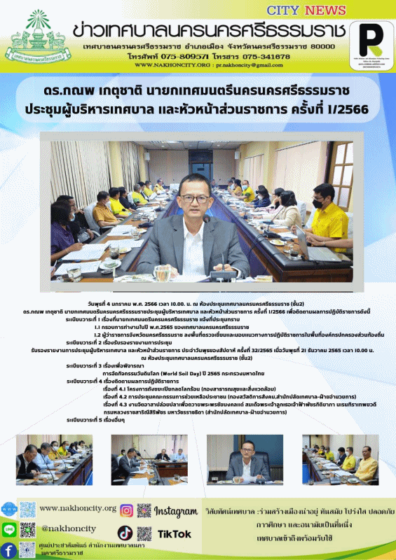 ดร.กณพ เกตุชาติ นายกเทศมนตรีนครนครศรีธรรมราช ประชุมผู้บริหารเทศบาล และหัวหน้าส่วนราชการ ครั้งที่ 1/2566 |