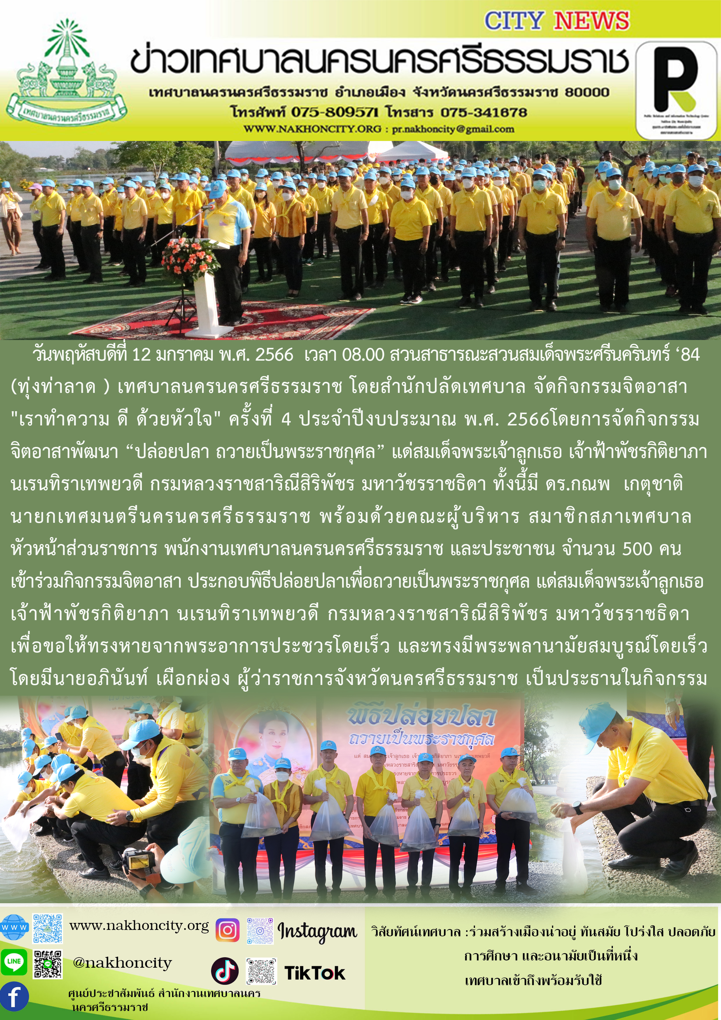 วันพฤหัสบดีที่ 12 มกราคม พ.ศ. 2566 เวลา 08.00 สวนสาธารณะสวนสมเด็จพระศรีนครินทร์ ‘84 (ทุ่งท่าลาด ) เทศบาลนครนครศรีธรรมราช โดยสำนักปลัดเทศบาล จัดกิจกรรมจิตอาสา "เราทำความ ดี ด้วยหัวใจ" ครั้งที่ 4 ประจำปีงบประมาณ พ.ศ. 2566 โดยการจัดกิจกรรมจิตอาสาพัฒนา “ปล่อยปลา ถวายเป็นพระราชกุศล” แด่สมเด็จพระเจ้าลูกเธอ เจ้าฟ้าพัชรกิติยาภา นเรนทิราเทพยวดี กรมหลวงราชสาริณีสิริพัชร มหาวัชรราชธิดา ทั้งนี้มี ดร.กณพ เกตุชาติ นายกเทศมนตรีนครนครศรีธรรมราช พร้อมด้วยคณะผู้บริหาร สมาชิกสภาเทศบาล หัวหน้าส่วนราชการ พนักงานเทศบาลนครนครศรีธรรมราช และประชาชน จำนวน 500 คน เข้าร่วมกิจกรรมจิตอาสาประกอบพิธีปล่อยปลาเพื่อถวายเป็นพระราชกุศล แด่สมเด็จพระเจ้าลูกเธอ เจ้าฟ้าพัชรกิติยาภา นเรนทิราเทพยวดี กรมหลวงราชสาริณีสิริพัชร มหาวัชรราชธิดา เพื่อขอให้ทรงหายจากพระอาการประชวรโดยเร็ว และทรงมีพระพลานามัยสมบูรณ์โดยเร็ว โดยมีนายอภินันท์ เผือกผ่อง ผู้ว่าราชการจังหวัดนครศรีธรรมราช เป็นประธานในพิธี