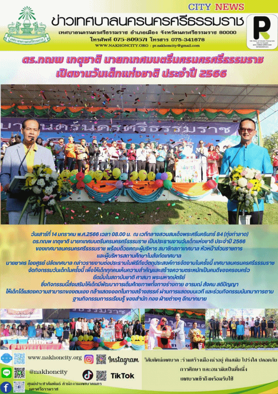 ดร.กณพ เกตุชาติ นายกเทศมนตรีนครนครศรีธรรมราช เป็นประธานเปิดงานวันเด็กแห่งชาติ ประจำปี 2566 ของเทศบาลนครนครศรีธรรมราช |