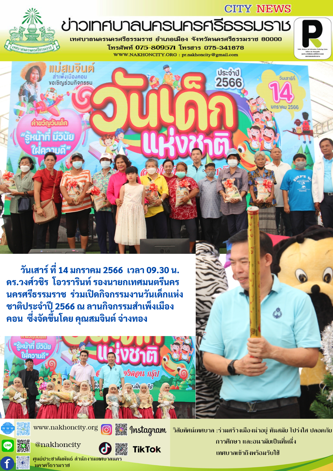 วันเสาร์ ที่ 14 มกราคม 2566 เวลา 09.30 น. ดร.วงศ์วชิร โอวรารินท์ รองนายกเทศมนตรีนครนครศรีธรรมราช ร่วมเปิดกิจกรรมงานวันเด็กแห่งชาติประจำปี 2566 ณ ลานกิจกรรมสำเพ็งเมืองคอน ซึ่งจัดขึ้นโดย คุณสมจินต์ จ่างทอง |