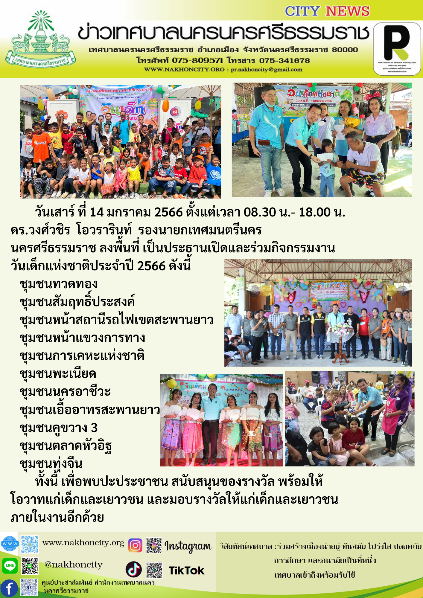 ดร.วงศ์วชิร โอวรารินท์ รองนายกเทศมนตรีนครนครศรีธรรมราช ลงพื้นที่ เป็นประธานเปิดและร่วมกิจกรรมงานวันเด็กแห่งชาติประจำปี 2566 |
